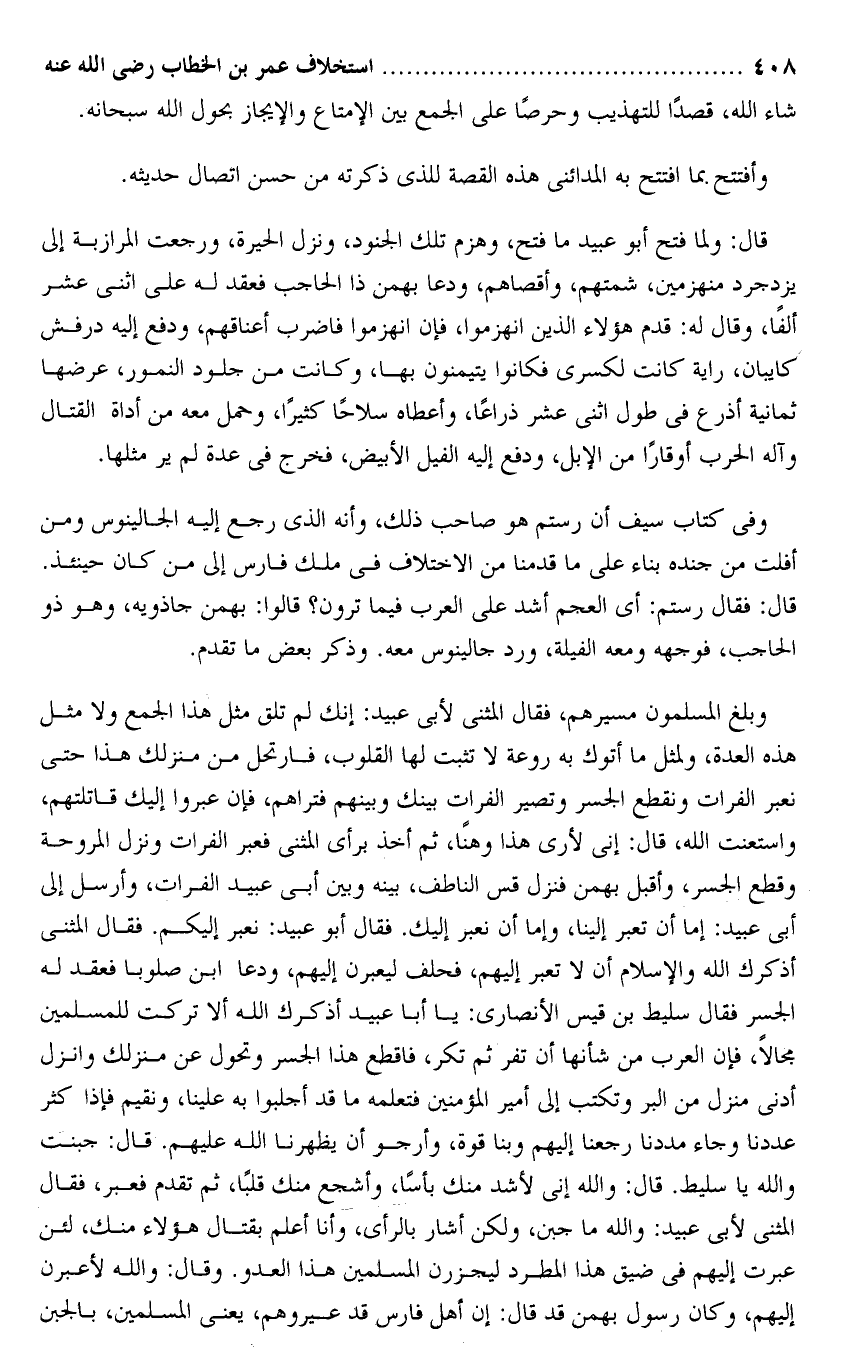 وبلغ المسلمون مسيرهم، فقال المثنى لأبى عبيد: إنك لم تلق مثل هذا الجمع ولا مثل هذه العدة، ولمثل ما أتوك به روعة لا تثبت لها القلوب، فارتحل من منزلك هذا حتى نعبر الفرات ونقطع الجسر وتصير الفرات بينك وبينهم فتراهم، فإن عبروا إليك قاتلتهم، واستعنت الله، قال: إنى لأرى هذا وهنا، ثم أخذ برأى المثنى فعبر الفرات ونزل المروحة وقطع الجسر، وأقبل بهمن فنزل قس الناطف، بينه وبين أبى عبيد الفرات، وأرسل إلى أبى عبيد: إما أن تعبر إلينا، وإما أن نعبر إليك. فقال أبو عبيد: نعبر إليكم. فقال المثنى أذكرك الله والإسلام أن لا تعبر إليهم، فحلف ليعبرن إليهم، ودعا ابن صلوبا فعقد له الجسر فقال سليط بن قيس الأنصارى: يا أبا عبيد أذكرك الله ألا تركت للمسلمين مجالا، فإن العرب من شأنها أن تفر ثم تكر، فاقطع هذا الجسر وتحول عن منزلك وانزل أدنى منزل من البر وتكتب إلى أمير المؤمنين فتعلمه ما قد أجلبوا به علينا، ونقيم فإذا كثر عددنا وجاء مددنا رجعنا إليهم وبنا قوة، وأرجو أن يظهرنا الله عليهم. قال: جبنت والله يا سليط. قال: والله إنى لأشد منك بأسا، وأشجع منك قلبا، ثم تقدم فعبر، فقال المثنى لأبى عبيد: والله ما جبن، ولكن أشار بالرأى، وأنا أعلم بقتال هؤلاء منك، لئن عبرت إليهم فى ضيق هذا المطرد ليجزرن المسلمين هذا العدو. وقال: والله لأعبرن إليهم، وكان رسول بهمن قد قال: إن أهل فارس قد عيروهم، يعنى المسلمين، بالجبن