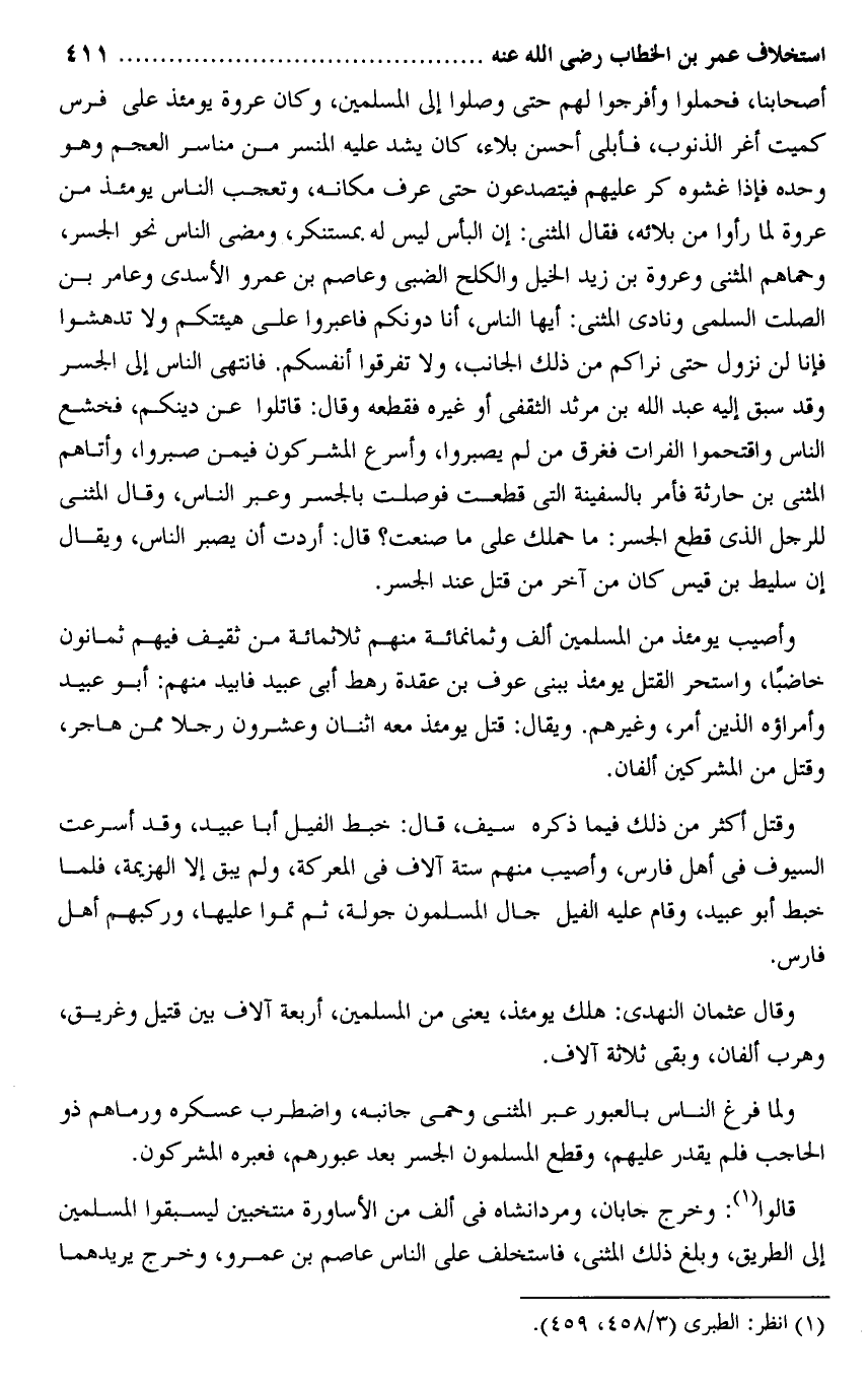 أصحابنا، فحملوا وأفرجوا لهم حتى وصلوا إلى المسلمين، وكان عروة يومئذ على فرس كميت أغر الذنوب، فأبلى أحسن بلاء، كان يشد عليه المنسر من مناسر العجم وهو وحده فإذا غشوه كر عليهم فيتصدعون حتى عرف مكانه، وتعجب الناس يومئذ من عروة لما رأوا من بلائه، فقال المثنى: إن البأس ليس له بمستنكر، ومضى الناس نحو الجسر، وحماهم المثنى وعروة بن زيد الخيل والكلح الضبى وعاصم بن عمرو الأسدى وعامر بن الصلت السلمى ونادى المثنى: أيها الناس، أنا دونكم فاعبروا على هيئتكم ولا تدهشوا فإنا لن نزول حتى نراكم من ذلك الجانب، ولا تفرقوا أنفسكم. فانتهى الناس إلى الجسر وقد سبق إليه عبد الله بن مرثد الثقفى أو غيره فقطعه وقال: قاتلوا عن دينكم، فخشع الناس واقتحموا الفرات فغرق من لم يصبروا، وأسرع المشركون فيمن صبروا، وأتاهم المثنى بن حارثة فأمر بالسفينة التى قطعت فوصلت بالجسر وعبر الناس، وقال المثنى للرجل الذى قطع الجسر: ما حملك على ما صنعت؟ قال: أردت أن يصبر الناس، ويقال إن سليط بن قيس كان من آخر من قتل عند الجسر.