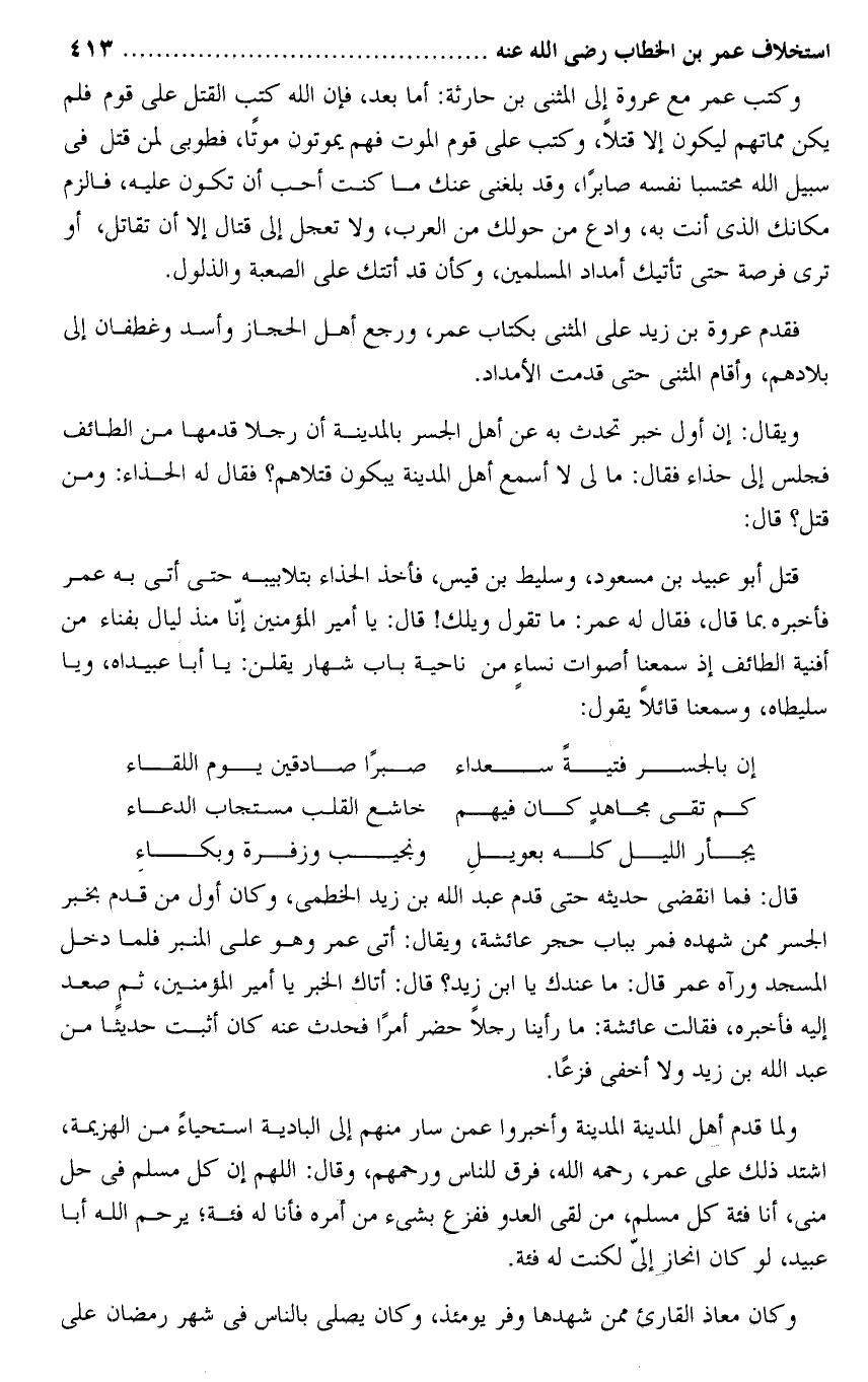ولما قدم أهل المدينة المدينة وأخبروا عمن سار منهم إلى البادية استحياء من الهزيمة، اشتد ذلك على عمر، رحمه الله، فرق للناس ورحمهم، وقال: اللهم إن كل مسلم فى حل منى، أنا فئة كل مسلم، من لقى العدو ففزع بشىء من أمره فأنا له فئة؛ يرحم الله أبا عبيد، لو كان انحاز إلىّ لكنت له فئة.