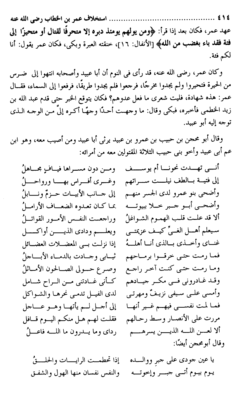عهد عمر، فكان بعد إذا قرأ: وَمَنْ يُوَلِّهِمْ يَوْمَئِذٍ دُبُرَهُ إِلَّا مُتَحَرِّفاً لِقِتالٍ أَوْ مُتَحَيِّزاً إِلى فِئَةٍ فَقَدْ باءَ بِغَضَبٍ مِنَ اللَّهِ [الأنفال: 16] ، خنقته العبرة وبكى، فكان عمر يقول: أنا لكم فئة.