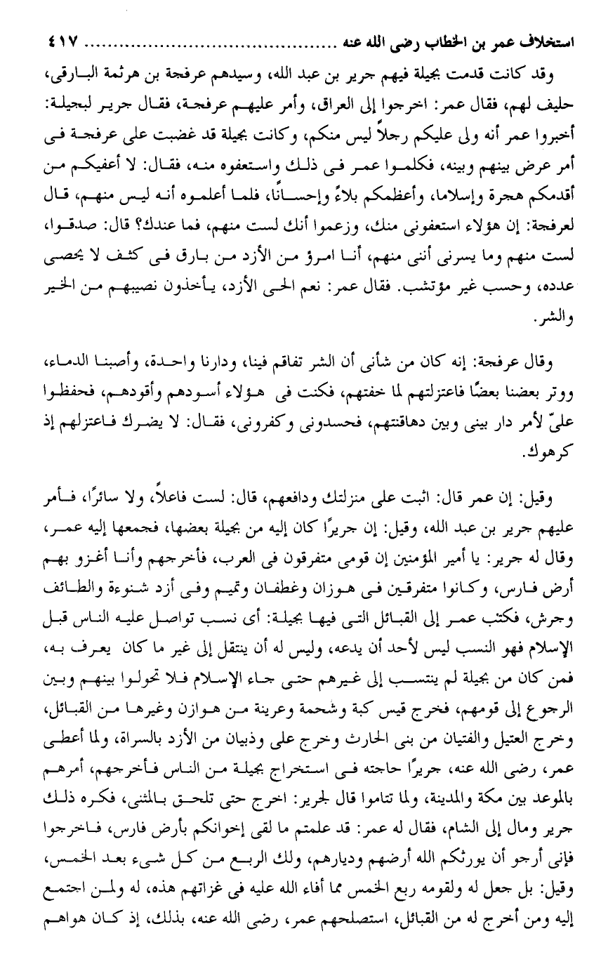 وقد كانت قدمت بجيلة فيهم جرير بن عبد الله، وسيدهم عرفجة بن هرثمة البارقى، حليف لهم، فقال عمر: اخرجوا إلى العراق، وأمر عليهم عرفجة، فقال جرير لبجيلة: