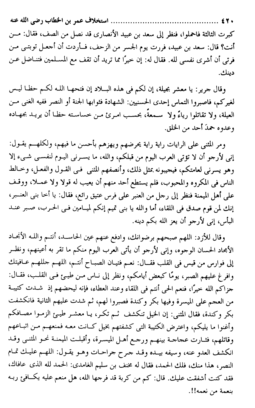 إنى لأرجو أن لا تؤتى العرب اليوم من قبلكم، والله، ما يسرنى اليوم لنفسى شىء إلا وهو يسرنى لعامتكم، فيجيبونه بمثل ذلك، وأنصفهم المثنى فى القول والفعل، وخالط الناس فى المكروه والمحبوب، فلم يستطع أحد منهم أن يعيب له قولا ولا عملا، ووقف على أهل الميمنة فنظر إلى رجل من العنبر على فرس عتيق رائع، فقال: يا أخا بنى العنبر، إنك لمن قوم صدق فى اللقاء، أما والله يا بنى تميم إنكم لميامين فى الحرب، صبر عند البأس، إنى لأرجو أن يعز الله بكم دينه.