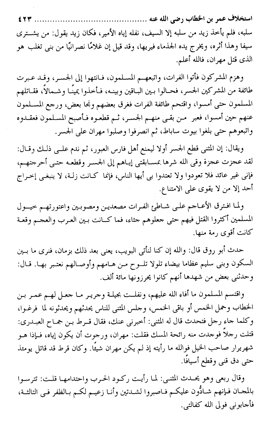 ولما افترق الأعاجم على شاطئ الفرات مصعدين ومصوبين واعتورتهم خيول المسلمين أكثروا القتل فيهم حتى جعلوهم جثاء، فما كانت بين العرب والعجم وقعة كانت أقوى رمة منها.