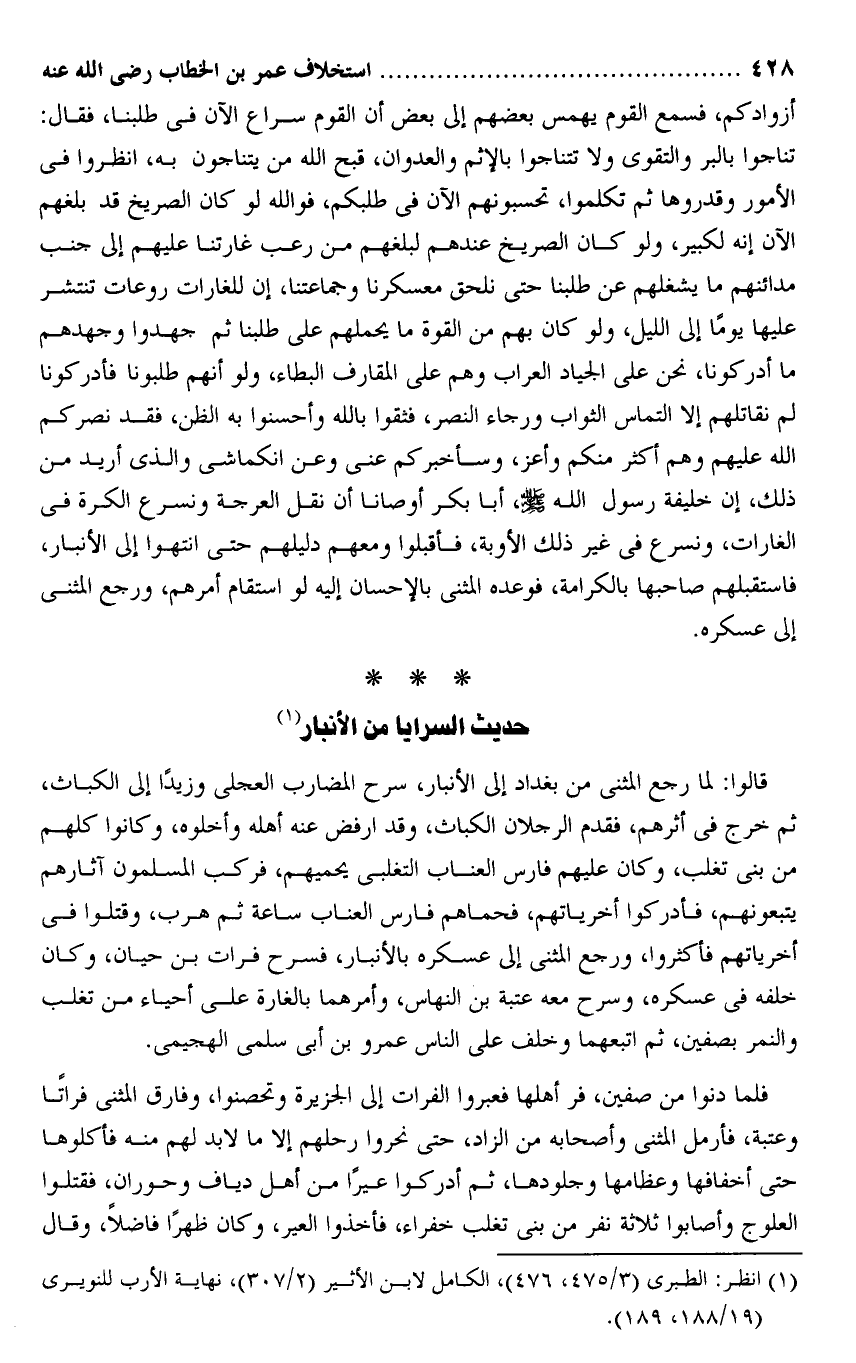 تناجوا بالبر والتقوى ولا تتناجوا بالإثم والعدوان، قبح الله من يتناجون به، انظروا فى الأمور وقدروها ثم تكلموا، تحسبونهم الآن فى طلبكم، فو الله لو كان الصريخ قد بلغهم الآن إنه لكبير، ولو كان الصريخ عندهم لبلغهم من رعب غارتنا عليهم إلى جنب مدائنهم ما يشغلهم عن طلبنا حتى نلحق معسكرنا وجماعتنا، إن للغارات روعات تنتشر عليها يوما إلى الليل، ولو كان بهم من القوة ما يحملهم على طلبنا ثم جهدوا وجهدهم ما أدركونا، نحن على الجياد العراب وهم على المقارف البطاء، ولو أنهم طلبونا فأدركونا لم نقاتلهم إلا التماس الثواب ورجاء النصر، فثقوا بالله وأحسنوا به الظن، فقد نصركم الله عليهم وهم أكثر منكم وأعز، وسأخبركم عنى وعن انكماشى والذى أريد من ذلك، إن خليفة رسول الله صلى الله عليه وسلم، أبا بكر أوصانا أن نقل العرجة ونسرع الكرة فى الغارات، ونسرع فى غير ذلك الأوبة، فأقبلوا ومعهم دليلهم حتى انتهوا إلى الأنبار، فاستقبلهم صاحبها بالكرامة، فوعده المثنى بالإحسان إليه لو استقام أمرهم، ورجع المثنى إلى عسكره.