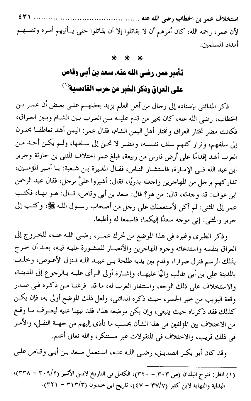 وذكر الطبرى وغيره فى هذا الموضع من تحرك عمر، رضى الله عنه، للخروج إلى العراق بنفسه واستدعائه وجوه المهاجرين والأنصار للمشورة عليه فيه، بعد أن خرج بذلك الرسم فنزل صرارا، وقدم بين يديه طلحة بن عبيد الله فنزل الأعوص، وخلف بالمدينة على بن أبى طالب واليا عليها، وإشارة أولى الرأى عليه بالرجوع إلى المدينة، والاستخلاف على ذلك الوجه، واستنفار العرب له، ما قد فرغنا من ذكره فى صدر وقعة البويب من خبر الجسر، حيث ذكره المدائنى، ولعل ذلك الموضع أولى به، فإن يكن كذلك فقد ذكرناه حيث ينبغى، وإن يكن موضعه هذا، فقد نبهنا عليه ليعرف ما وقع من الاختلاف بين المؤلفين فى هذا الشأن بحسب ما تأذى إليهم من جهة النقل، والأمر فى ذلك قريب، والاختلاف فى المنقولات غير مستنكر، والله تعالى أعلم.