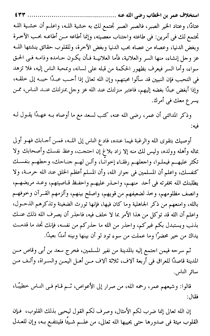 أوصيك بتقوى الله والرغبة فيما عنده، فادع الناس إلى الله، فمن أجابك فهو أولى بماله وأهله وولده، وليس لك منه إلا زاد بلاغ إن احتجت، وعظ نفسك وأصحابك ولا تكثر عليهم فيملوا، واجعلهم رفقاء إخوانا، وألن لهم جناحك، وحطهم بنفسك كنفسك، واعلم أن المسلمين فى جوار الله، وأن المسلم أعظم الخلق عند الله حرمة، ولا يطلبنك الله بخفرته فى أحد منهم، واحذر عليهم واحفظ قاصيتهم، وعد مريضهم، وانصف مظلومهم، وخذ لضعيفهم من قويهم، واصلح بينهم، وألزمهم القرآن وخوفهم بالله، وامنعهم من ذكر الجاهلية وما كان فيها، فإنها تورث الضغينة وتذكرهم الذحول، واعلم أن الله قد توكل من هذا الأمر بما لا خلف فيه، فاحذر أن يصرف الله ذلك عنك بذنب ويستبدل بكم غيركم، واحذر من الله ما حذركم من نفسه، فإنك تجد ما قدمت يداك من خير محضرا وما عملت من سوء تود لو أن بينها وبينه أمدا بعيدا.