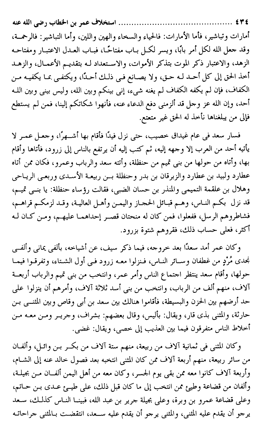 وكان عمر أمد سعدا بعد خروجه، فيما ذكر سيف، عن أشياخه، بألفى يمانى وألفى نجدى مرد من غطفان وسائر الناس، فنزلوا معه زرود فى أول الشتاء، وتفرقوا فيما حولها، وأقام سعد ينتظر اجتماع الناس وأمر عمر، وانتخب من بنى تميم والرباب أربعة آلاف، منهم ألف من الرباب، وانتخب من بنى أسد ثلاثة آلاف، وأمرهم أن ينزلوا على حد أرضهم بين الحزن والبسيطة، فأقاموا هنالك بين سعد بن أبى وقاص وبين المثنى بن حارثة، والمثنى بذى قار، ويقال: بأليس، وقال بعضهم: بشراف، وجرير ومن معه من أخلاط الناس متفرقون فيما بين العذيب إلى خصى، ويقال: غضى.