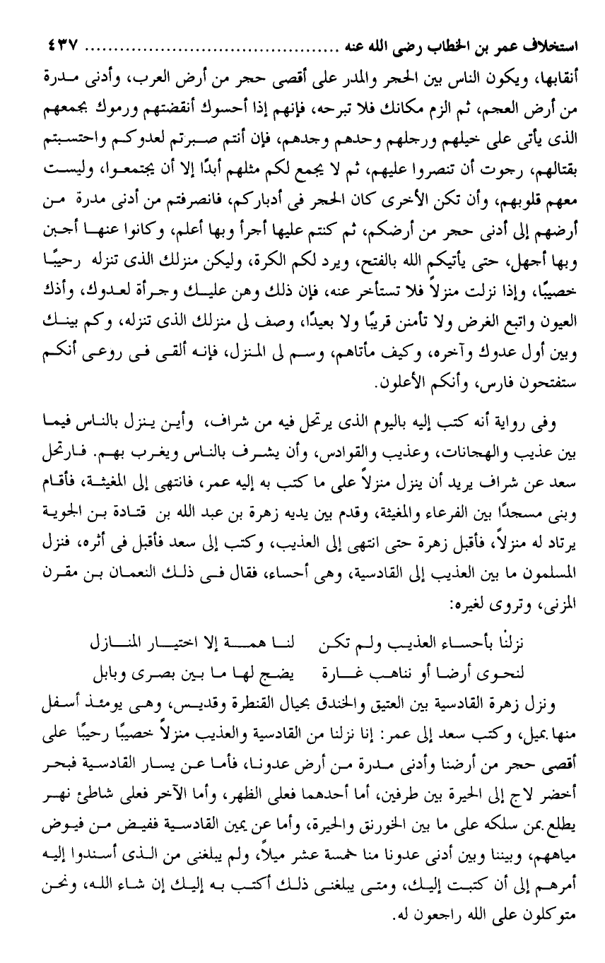 أنقابها، ويكون الناس بين الحجر والمدر على أقصى حجر من أرض العرب، وأدنى مدرة من أرض العجم، ثم الزم مكانك فلا تبرحه، فإنهم إذا أحسوك أنقضتهم ورموك بجمعهم الذى يأتى على خيلهم ورجلهم وحدهم وجدهم، فإن أنتم صبرتم لعدوكم واحتسبتم بقتالهم، رجوت أن تنصروا عليهم، ثم لا يجمع لكم مثلهم أبدا إلا أن يجتمعوا، وليست معهم قلوبهم، وأن تكن الأخرى كان الحجر فى أدباركم، فانصرفتم من أدنى مدرة من أرضهم إلى أدنى حجر من أرضكم، ثم كنتم عليها أجرأ وبها أعلم، وكانوا عنها أجبن وبها أجهل، حتى يأتيكم الله بالفتح، ويرد لكم الكرة، وليكن منزلك الذى تنزله رحيبا خصيبا، وإذا نزلت منزلا فلا تستأخر عنه، فإن ذلك وهن عليك وجرأة لعدوك، وأذك العيون واتبع الغرض ولا تأمنن قريبا ولا بعيدا، وصف لى منزلك الذى تنزله، وكم بينك وبين أول عدوك وآخره، وكيف مأتاهم، وسم لى المنزل، فإنه ألقى فى روعى أنكم ستفتحون فارس، وأنكم الأعلون.