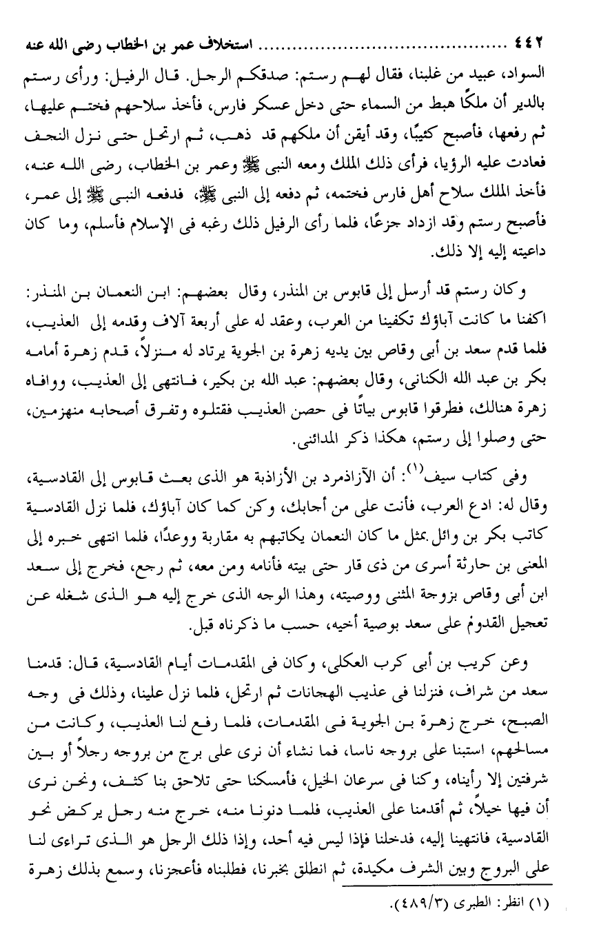 السواد، عبيد من غلبنا، فقال لهم رستم: صدقكم الرجل. قال الرفيل: ورأى رستم بالدير أن ملكا هبط من السماء حتى دخل عسكر فارس، فأخذ سلاحهم فختم عليها، ثم رفعها، فأصبح كئيبا، وقد أيقن أن ملكهم قد ذهب، ثم ارتحل حتى نزل النجف فعادت عليه الرؤيا، فرأى ذلك الملك ومعه النبى صلى الله عليه وسلم وعمر بن الخطاب، رضى الله عنه، فأخذ الملك سلاح أهل فارس فختمه، ثم دفعه إلى النبى صلى الله عليه وسلم، فدفعه النبى صلى الله عليه وسلم إلى عمر، فأصبح رستم وقد ازداد جزعا، فلما رأى الرفيل ذلك رغبه فى الإسلام فأسلم، وما كان داعيته إليه إلا ذلك.
