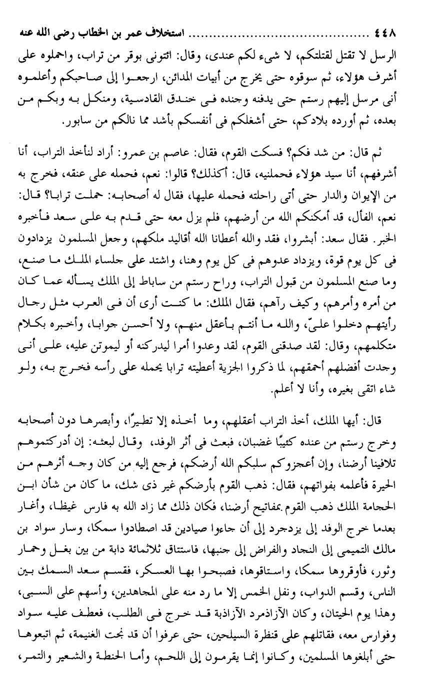 الرسل لا تقتل لقتلتكم، لا شىء لكم عندى، وقال: ائتونى بوقر من تراب، واحملوه على أشرف هؤلاء، ثم سوقوه حتى يخرج من أبيات المدائن، ارجعوا إلى صاحبكم وأعلموه أنى مرسل إليهم رستم حتى يدفنه وجنده فى خندق القادسية، ومنكل به وبكم من بعده، ثم أورده بلادكم، حتى أشغلكم فى أنفسكم بأشد مما نالكم من سابور.