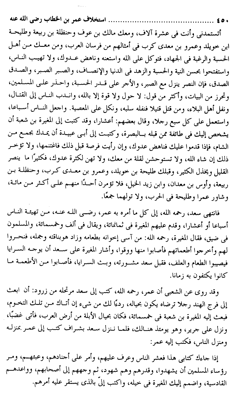 أتستمدنى وأنت فى عشرة آلاف، ومعك مالك بن عوف وحنظلة بن ربيعة وطليحة ابن خويلد وعمرو بن معدى كرب فى أمثالهم من فرسان العرب، ومن معك من أهل الحسبة والرغبة فى الجهاد، فتوكل على الله واستعنه وناهض عدوك، ولا تهيب الناس، واستفتحوا بحسن النية والحسبة والزهد فى الدنيا والإنصاف، والصبر الصبر، والصدق الصدق، فإن النصر ينزل مع الصبر، والأجر على قدر الحسبة، واحذر على المسلمين، وتحرز من البيات، وأكثر من قول: لا حول ولا قوة إلا بالله، واندب الناس إلى القتال، ونفل أهل البلاء، ومن قتل قتيلا فنفله سلبه، ونكل على المعصية. واجعل الناس أسباعا، واستعمل على كل سبع رجلا، وقال بعضهم: أعشارا، وقد كتبت إلى المغيرة بن شعبة أن يشخص إليك فى طائفة ممن قبله بالبصرة، وكتبت إلى أبى عبيدة أن يمدك بجمع من الشام، فإذا قدموا عليك فناهض عدوك، وإن رأيت فرصة قبل ذلك فاغتنمها، ولا تؤخر ذلك إن شاء الله، ولا تستوحشن لقلة من معك، ولا تهن لكثرة عدوك، فكثيرا ما ينصر القليل ويخذل الكثير، وقبلك طليحة بن خويلد، وعمرو بن معدى كرب، وحنظلة بن ربيعة، وأوس بن معدان، وابن زيد الخيل، فلا تؤمرن أحدا منهم على أكثر من مائة، وشاور عمرا وطليحة فى الحرب، ولا تولهما جمعا.