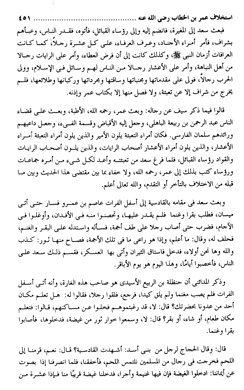 فبعث سعد إلى المغيرة، فانضم إليه وإلى رؤساء القبائل، فأتوه، فقدر الناس، وعبأهم بشراف، فأمر أمراء الأجناد، وعرف العرفاء، على كل عشرة رجلا، كما كانت العرافات أزمان النبى صلى الله عليه وسلم، وكذلك كانت إلى أن فرض العطاء، وأمر على الرايات رجالا من أهل النباهة، وأمر على الأعشار رجالا من الناس لهم وسائل فى الإسلام، وولى الحرب رجالا، فولى على مقدماتها ومجنباتها وساقتها ومجرداتها وركبانها وطلائعها، فلم يخرج من شراف إلا عن تعبئة، ولا فصل منها إلا بكتاب عمر وإذنه.