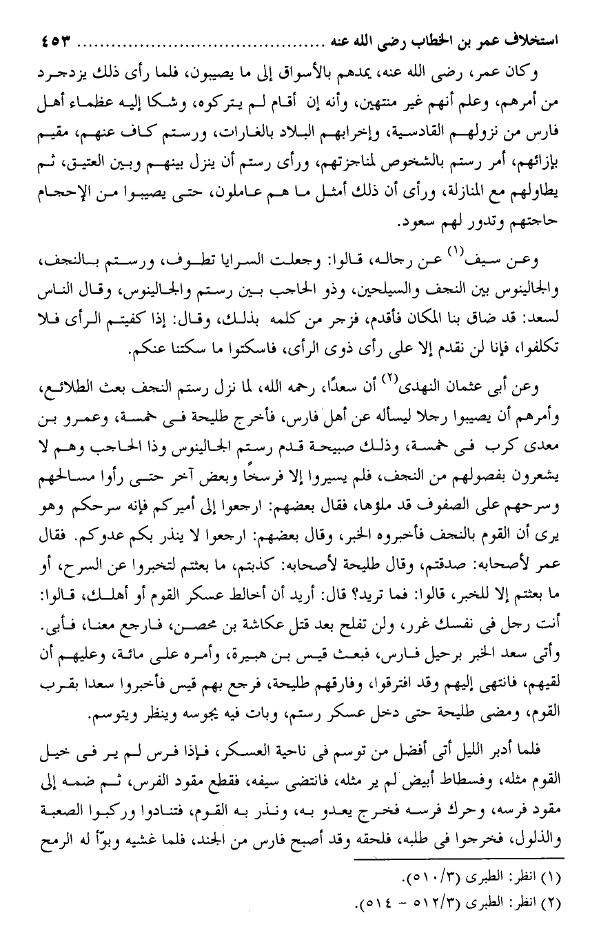وعن أبى عثمان النهدى «2» أن سعدا، رحمه الله، لما نزل رستم النجف بعث الطلائع، وأمرهم أن يصيبوا رجلا ليسأله عن أهل فارس، فأخرج طليحة فى خمسة، وعمرو بن معدى كرب فى خمسة، وذلك صبيحة قدم رستم الجالينوس وذا الحاجب وهم لا يشعرون بفصولهم من النجف، فلم يسيروا إلا فرسخا وبعض آخر حتى رأوا مسالحهم وسرحهم على الصفوف قد ملؤها، فقال بعضهم: ارجعوا إلى أميركم فإنه سرحكم وهو يرى أن القوم بالنجف فأخبروه الخبر، وقال بعضهم: ارجعوا لا ينذر بكم عدوكم. فقال عمر لأصحابه: صدقتم، وقال طليحة لأصحابه: كذبتم، ما بعثتم لتخبروا عن السرح، أو ما بعثتم إلا للخبر، قالوا: فما تريد؟ قال: أريد أن أخالط عسكر القوم أو أهلك، قالوا: