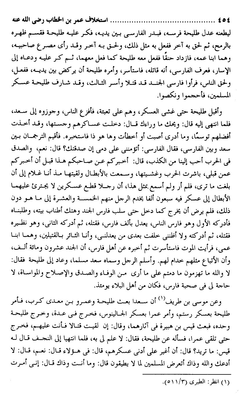 وأقبل طليحة حتى غشى العسكر، وهم على تعبئة، فأفزع الناس، وجوزوه إلى سعد، فلما انتهى إليه قال: ويحك ما وراءك قال: دخلت عساكرهم وجستها، وقد أخذت أفضلهم توسما، وما أدرى أصبت أو أخطأت وها هو ذا فاستخبره. فأقيم الترجمان بين سعد وبين الفارسى، فقال الفارسى: أتؤمننى على دمى إن صدقتك؟ قال: نعم، والصدق فى الحرب أحب إلينا من الكذب، قال: أخبركم عن صاحبكم هذا قبل أن أخبركم عمن قبلى، باشرت الحرب وغشيتها، وسمعت بالأبطال ولقيتها مذ أنا غلام إلى أن بلغت ما ترى، فلم أر ولم أسمع بمثل هذا، أن رجلا قطع عسكرين لا يجترئ عليهما الأبطال إلى عسكر فيه سبعون ألفا يخدم الرجل منهم الخمسة والعشرة إلى ما هو دون ذلك، فلم يرض أن يخرج كما دخل حتى سلب فارس الجند وهتك أطناب بيته، وطلبناه فأدركه الأول وهو فارس الناس، يعدل بألف فارس، فقتله، ثم أدركه الثانى، وهو نظيره فقتله، ثم أدركته ولا أظننى خلفت بعدى من يعدلنى، وأنا الثائر بالقتيلين، وهما ابنا عمى، فرأيت الموت فاستأسرت ثم أخبره عن أهل فارس، أن الجند عشرون ومائة ألف، وأن الأتباع مثلهم خدام لهم. وأسلم الرجل وسماه سعد مسلما، وعاد إلى طليحة فقال: