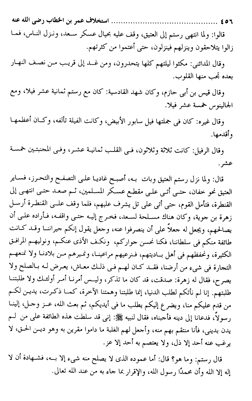 قال: ولما نزل رستم العتيق وبات به، أصبح غاديا على التصفح والتحرز، فساير العتيق نحو خفان، حتى أتى على مقطع عسكر المسلمين، ثم صعد حتى انتهى إلى القنطرة، فتأمل القوم، حتى أتى على تل يشرف عليهم، فلما وقف على القنطرة أرسل زهرة بن جوية، وكان هناك مسلحة لسعد، فخرج إليه حتى واقفه، فأراده على أن يصالحهم، ويجعل له جعلا على أن ينصرفوا عنه، وجعل يقول إنكم جيراننا وقد كانت طائفة منكم فى سلطاننا، فكنا نحسن جواركم، ونكف الأذى عنكم، ونوليهم المرافق الكثيرة، ونحفظهم فى أهل باديتهم، فنرعيهم مراعينا، ونميرهم من بلادنا ولا نمنعهم التجارة فى شىء من أرضنا، فقد كان لهم فى ذلك معاش، يعرض له بالصلح ولا يصرح، فقال له زهرة: صدقت، قد كان ما تذكر، وليس أمرنا أمر أولئك ولا طلبتنا طلبتهم. إنا لم نأتكم لطلب الدنيا، إنما طلبتنا وهمتنا الآخرة، كما ذكرت، يدين لكم من قدم عليكم منا، ويضرع إليكم يطلب ما فى أيديكم، ثم بعث الله، عز وجل، إلينا رسولا، فدعانا إلى دينه فأجبناه، فقال لنبيه صلى الله عليه وسلم: إنى قد سلطت هذه الطائفة على من لم يدن بدينى، فأنا منتقم بهم منه، وأجعل لهم الغلبة ما داموا مقرين به وهو دين الحق، لا يرغب عنه أحد إلا ذل، ولا يعتصم به أحد إلا عز.