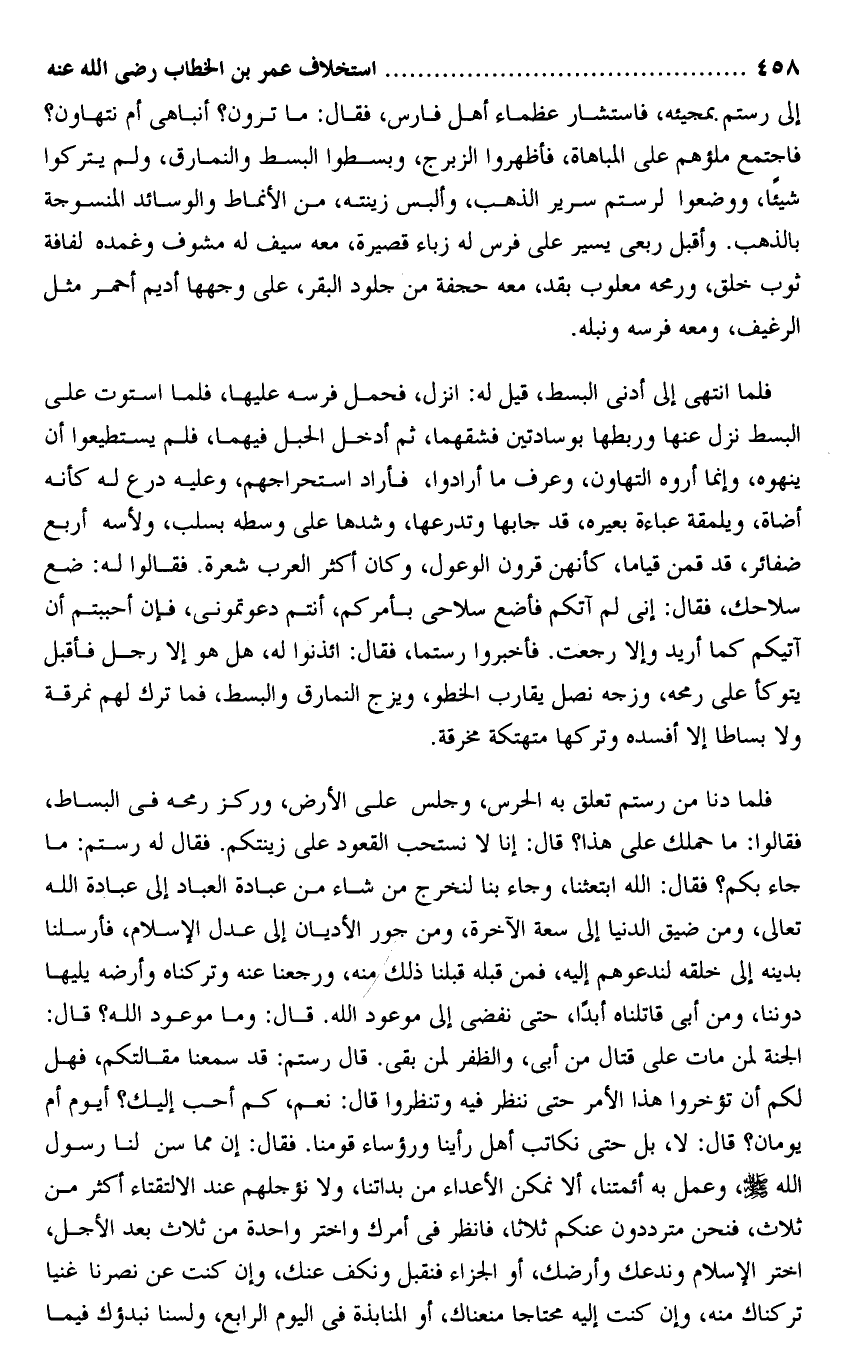 الجنة لمن مات على قتال من أبى، والظفر لمن بقى. قال رستم: قد سمعنا مقالتكم، فهل لكم أن تؤخروا هذا الأمر حتى ننظر فيه وتنظروا قال: نعم، كم أحب إليك؟ أيوم أم يومان؟ قال: لا، بل حتى نكاتب أهل رأينا ورؤساء قومنا. فقال: إن مما سن لنا رسول الله صلى الله عليه وسلم، وعمل به أئمتنا، ألا نمكن الأعداء من بداتنا، ولا نؤجلهم عند الالتقاء أكثر من ثلاث، فنحن مترددون عنكم ثلاثا، فانظر فى أمرك واختر واحدة من ثلاث بعد الأجل، اختر الإسلام وندعك وأرضك، أو الجزاء فنقبل ونكف عنك، وإن كنت عن نصرنا غنيا تركناك منه، وإن كنت إليه محتاجا منعناك، أو المنابذة فى اليوم الرابع، ولسنا نبدؤك فيما