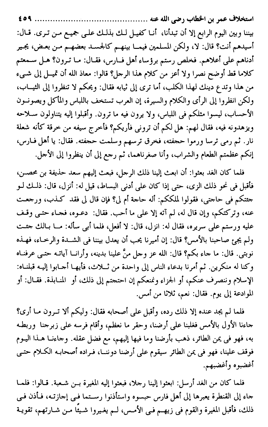 أسيدهم أنت؟ قال: لا، ولكن المسلمين فيما بينهم كالجسد بعضهم من بعض، يجير أدناهم على أعلاهم. فخلص رستم برؤساء أهل فارس، فقال: ما ترون؟ هل سمعتم كلاما قط أوضح نصرا ولا أعز من كلام هذا الرجل؟ قالوا: معاذ الله أن تميل إلى شىء من هذا وتدع دينك لهذا الكلب، أما ترى إلى ثيابه فقال: ويحكم لا تنظروا إلى الثياب، ولكن انظروا إلى الرأى والكلام والسيرة، إن العرب تستخف باللباس والمأكل ويصونون الأحساب، ليسوا مثلكم فى اللباس، ولا يرون فيه ما ترون. وأقبلوا إليه يتناولون سلاحه ويزهدونه فيه، فقال لهم: هل لكم أن ترونى فأريكم؟ فأخرج سيفه من خرقة كأنه شعلة نار. ثم رمى ترسا ورموا حجفته، فخرق ترسهم وسلمت حجفته. فقال: يا أهل فارس، إنكم عظمتم الطعام والشراب، وأنا صغرناهما، ثم رجع إلى أن ينظروا إلى الأجل.