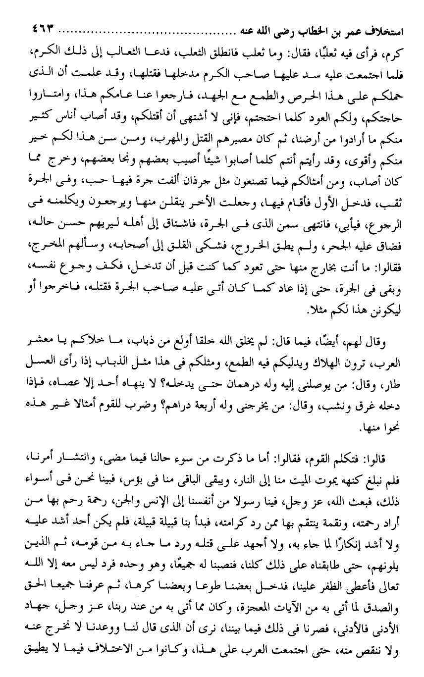 قالوا: فتكلم القوم، فقالوا: أما ما ذكرت من سوء حالنا فيما مضى، وانتشار أمرنا، فلم نبلغ كنهه يموت الميت منا إلى النار، ويبقى الباقى منا فى بؤس، فبينا نحن فى أسواء ذلك، فبعث الله، عز وجل، فينا رسولا من أنفسنا إلى الإنس والجن، رحمة رحم بها من أراد رحمته، ونقمة ينتقم بها ممن رد كرامته، فبدأ بنا قبيلة قبيلة، فلم يكن أحد أشد عليه ولا أشد إنكارا لما جاء به، ولا أجهد على قتله ورد ما جاء به من قومه، ثم الذين يلونهم، حتى طابقناه على ذلك كلنا، فنصبنا له جميعا، وهو وحده فرد ليس معه إلا الله تعالى فأعطى الظفر علينا، فدخل بعضنا طوعا وبعضنا كرها، ثم عرفنا جميعا الحق والصدق لما أتى به من الآيات المعجزة، وكان مما أتى به من عند ربنا، عز وجل، جهاد الأدنى فالأدنى، فصرنا فى ذلك فيما بيننا، نرى أن الذى قال لنا ووعدنا لا نخرج عنه ولا ننقص منه، حتى اجتمعت العرب على هذا، وكانوا من الاختلاف فيما لا يطيق