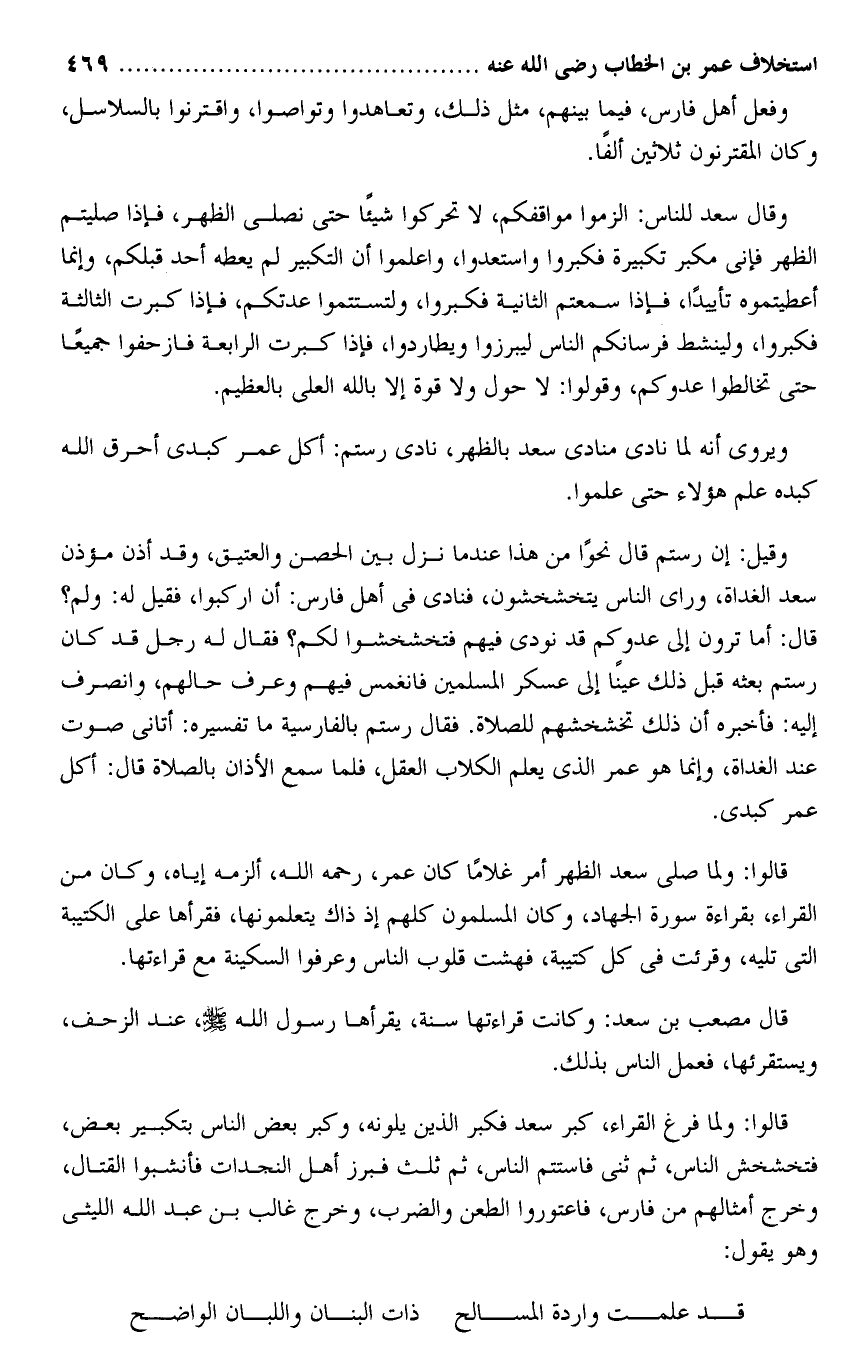 قال: أما ترون إلى عدوكم قد نودى فيهم فتخشخشوا لكم؟ فقال له رجل قد كان رستم بعثه قبل ذلك عينا إلى عسكر المسلمين فانغمس فيهم وعرف حالهم، وانصرف إليه: فأخبره أن ذلك تخشخشهم للصلاة. فقال رستم بالفارسية ما تفسيره: أتانى صوت عند الغداة، وإنما هو عمر الذى يعلم الكلاب العقل، فلما سمع الأذان بالصلاة قال: أكل عمر كبدى.