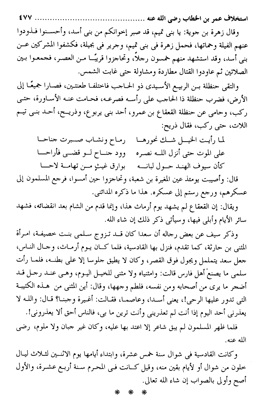 وكانت القادسية فى شوال سنة خمس عشرة، وابتداء أيامها يوم الاثنين لثلاث ليال خلون من شوال أو لأيام بقين منه، وقيل كانت فى المحرم سنة أربع عشرة، والأول أصح وأولى بالصواب إن شاء الله تعالى.