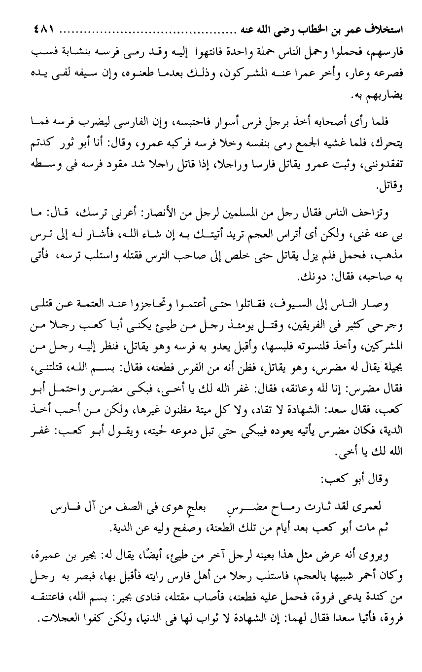 وصار الناس إلى السيوف، فقاتلوا حتى أعتموا وتحاجزوا عند العتمة عن قتلى وجرحى كثير فى الفريقين، وقتل يومئذ رجل من طيئ يكنى أبا كعب رجلا من المشركين، وأخذ قلنسوته فلبسها، وأقبل يعدو به فرسه وهو يقاتل، فنظر إليه رجل من بجيلة يقال له مضرس، وهو يقاتل، فظن أنه من الفرس فطعنه، فقال: بسم الله، قتلتنى، فقال مضرس: إنا لله وعانقه، فقال: غفر الله لك يا أخى، فبكى مضرس واحتمل أبو كعب، فقال سعد: الشهادة لا تقاد، ولا كل ميتة مظنون غيرها، ولكن من أحب أخذ الدية، فكان مضرس يأتيه يعوده فيبكى حتى تبل دموعه لحيته، ويقول أبو كعب: غفر الله لك يا أخى.