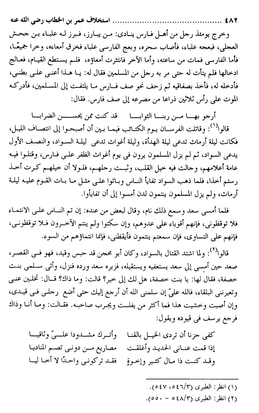 فلما أمسى سعد وسمع ذلك نام، وقال لبعض من عنده: إن تم الناس على الانتماء فلا توقظونى، فإنهم أقوياء على عدوهم، وإن سكتوا ولم ينتم الآخرون فلا توقظونى، فإنهم على التساوى، فإن سمعتم ينتمون فأيقظنى، فإنما انتماؤهم من السوء.