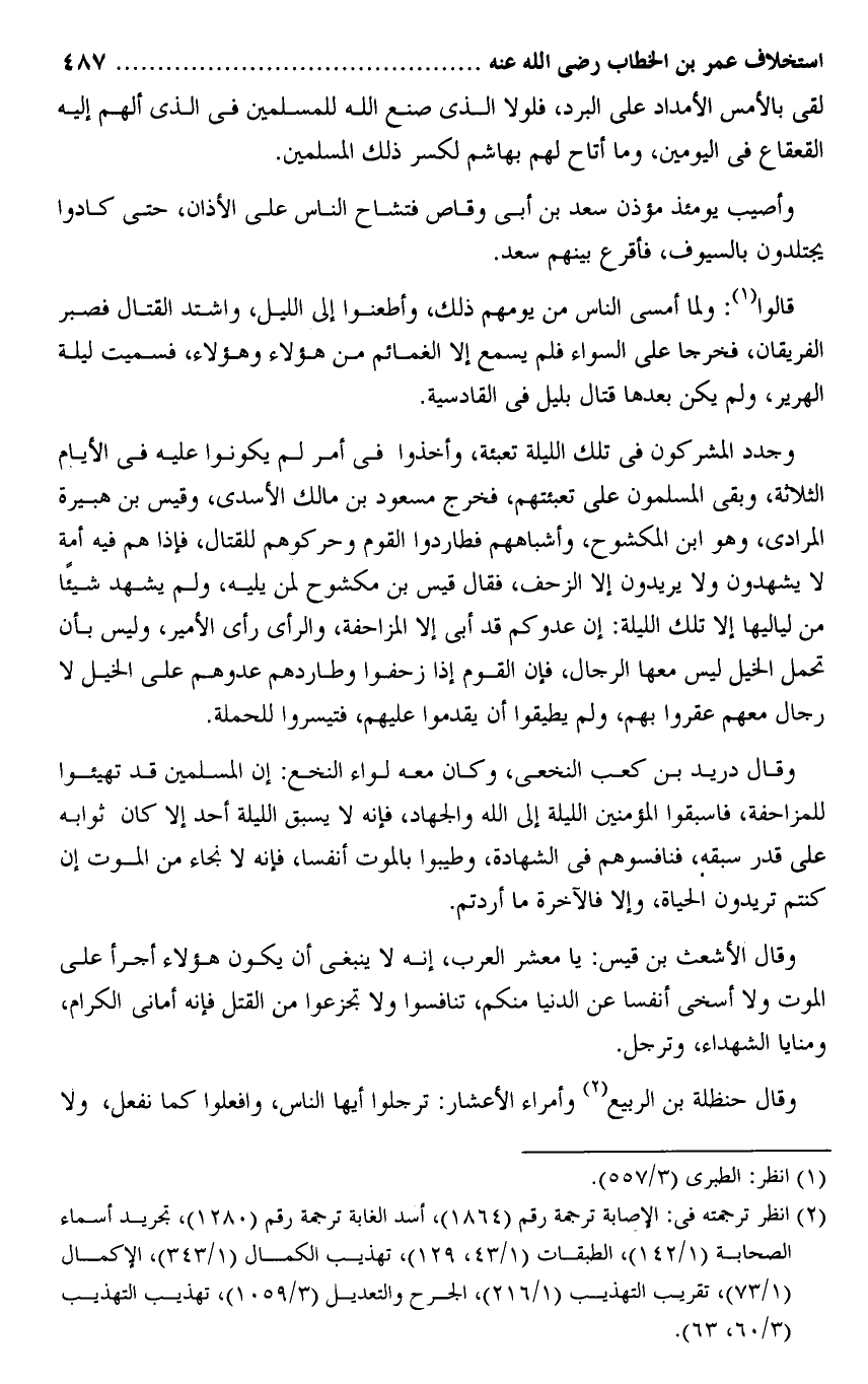 لقى بالأمس الأمداد على البرد، فلولا الذى صنع الله للمسلمين فى الذى ألهم إليه القعقاع فى اليومين، وما أتاح لهم بهاشم لكسر ذلك المسلمين.