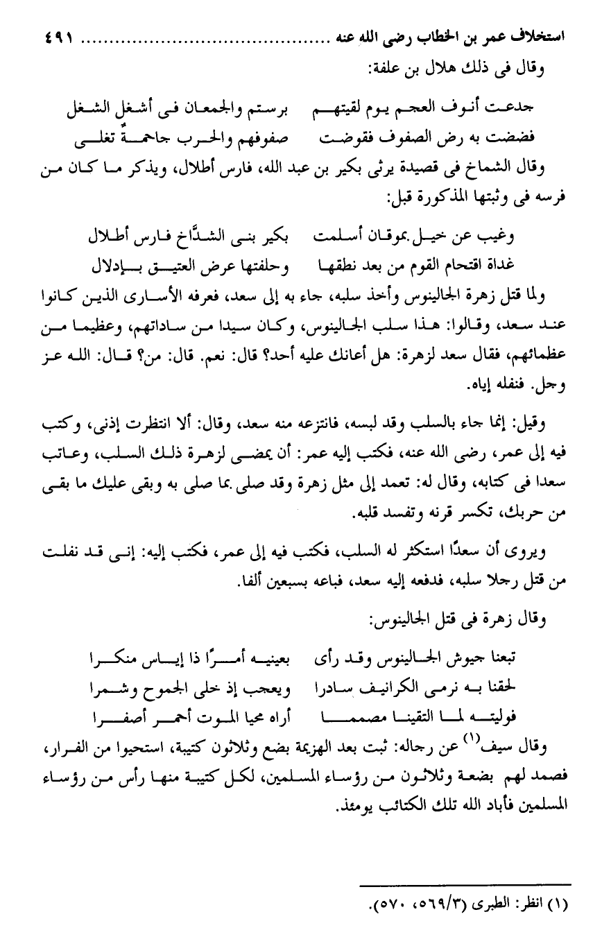 وقيل: إنما جاء بالسلب وقد لبسه، فانتزعه منه سعد، وقال: ألا انتظرت إذنى، وكتب فيه إلى عمر، رضى الله عنه، فكتب إليه عمر: أن يمضى لزهرة ذلك السلب، وعاتب سعدا فى كتابه، وقال له: تعمد إلى مثل زهرة وقد صلى بما صلى به وبقى عليك ما بقى من حربك، تكسر قرنه وتفسد قلبه.