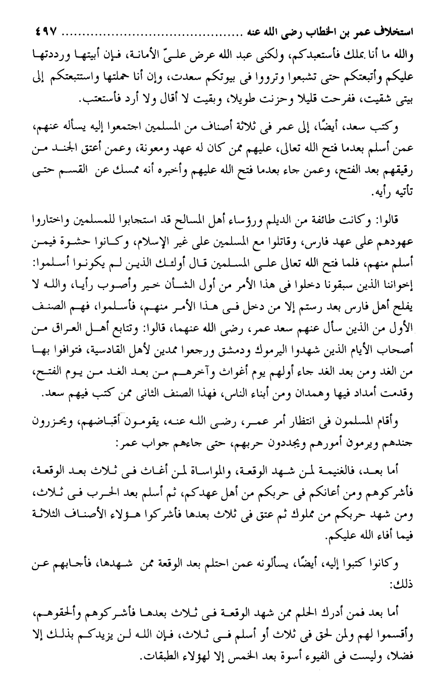 وكتب سعد، أيضا، إلى عمر فى ثلاثة أصناف من المسلمين اجتمعوا إليه يسأله عنهم، عمن أسلم بعد ما فتح الله تعالى، عليهم ممن كان له عهد ومعونة، وعمن أعتق الجند من رقيقهم بعد الفتح، وعمن جاء بعد ما فتح الله عليهم وأخبره أنه ممسك عن القسم حتى تأتيه رأيه.