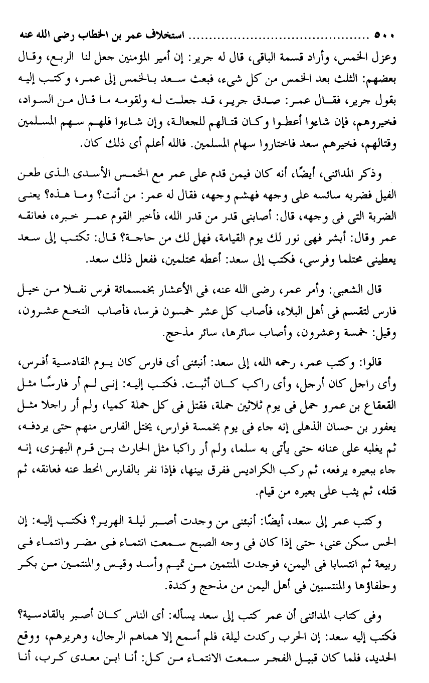 وكتب عمر إلى سعد، أيضا: أنبئنى من وجدت أصبر ليلة الهرير؟ فكتب إليه: إن الحس سكن عنى، حتى إذا كان فى وجه الصبح سمعت انتماء فى مضر وانتماء فى ربيعة ثم انتسابا فى اليمن، فوجدت المنتمين من تميم وأسد وقيس والمنتمين من بكر وحلفاؤها والمنتسبين فى أهل اليمن من مذحج وكندة.