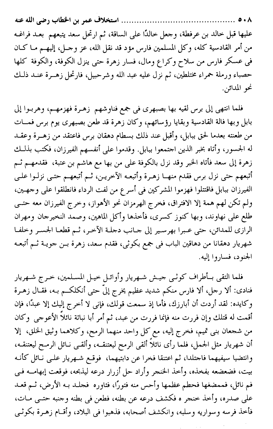 عليها قبل خالد بن عرفطة، وجعل خالدا على الساقة، ثم ارتحل سعد يتبعهم بعد فراغه من أمر القادسية كله، وكل المسلمين فارس مؤد قد نقل الله، عز وجل، إليهم ما كان فى عسكر فارس من سلاح وكراع ومال، فسار زهرة حتى ينزل الكوفة، والكوفة كلها حصباء ورملة حمراء مختلطين، ثم نزل عليه عبد الله وشرحبيل، فارتحل زهرة عند ذلك نحو المدائن.