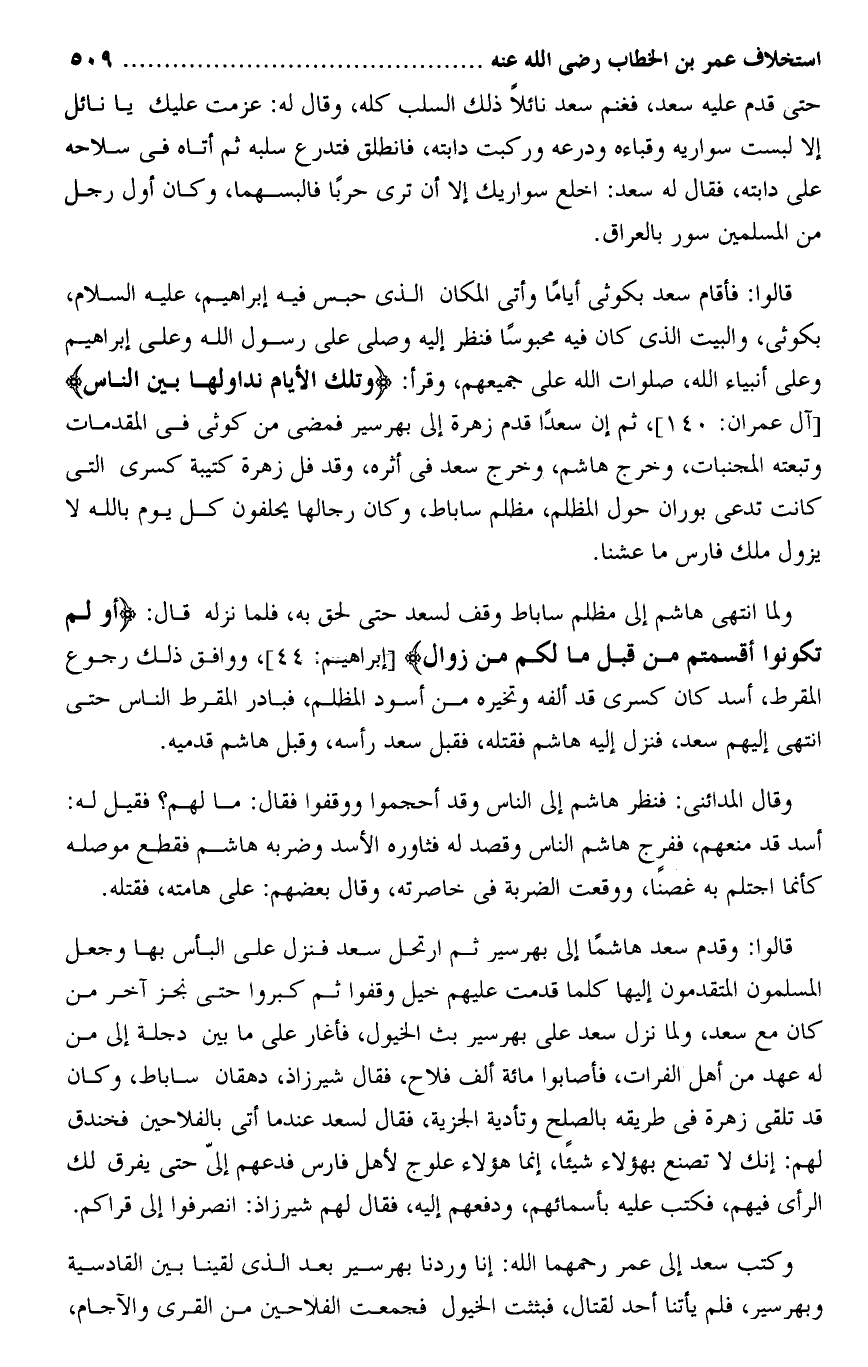 قالوا: فأقام سعد بكوثى أياما وأتى المكان الذى حبس فيه إبراهيم، عليه السلام، بكوثى، والبيت الذى كان فيه محبوسا فنظر إليه وصلى على رسول الله وعلى إبراهيم وعلى أنبياء الله، صلوات الله على جميعهم، وقرأ: وَتِلْكَ الْأَيَّامُ نُداوِلُها بَيْنَ النَّاسِ [آل عمران: 140] ، ثم إن سعدا قدم زهرة إلى بهرسير فمضى من كوثى فى المقدمات وتبعته المجنبات، وخرج هاشم، وخرج سعد فى أثره، وقد فل زهرة كتيبة كسرى التى كانت تدعى بوران حول المظلم، مظلم ساباط، وكان رجالها يحلفون كل يوم بالله لا يزول ملك فارس ما عشنا.