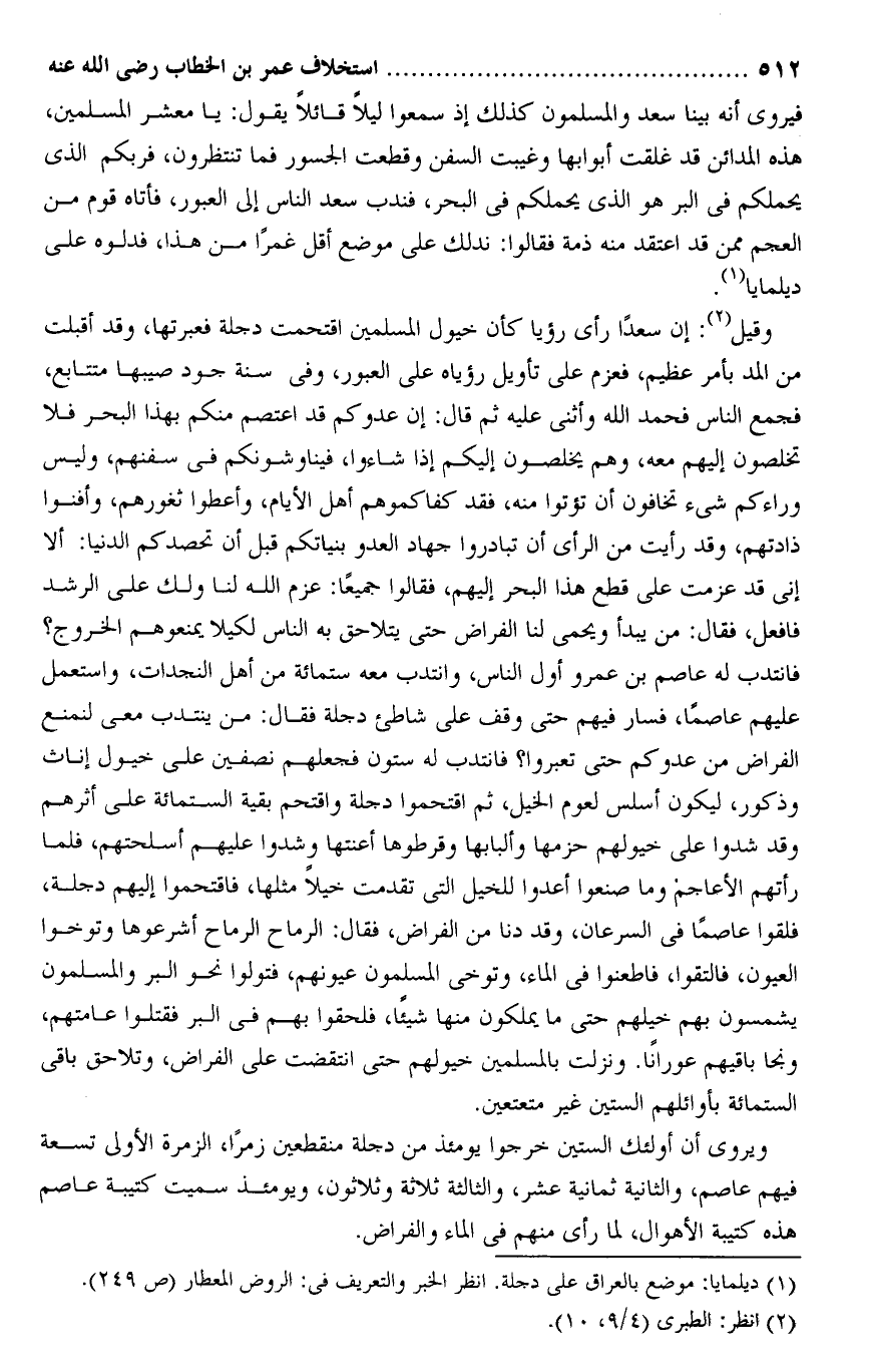 وقيل «2» : إن سعدا رأى رؤيا كأن خيول المسلمين اقتحمت دجلة فعبرتها، وقد أقبلت من المد بأمر عظيم، فعزم على تأويل رؤياه على العبور، وفى سنة جود صيبها متتابع، فجمع الناس فحمد الله وأثنى عليه ثم قال: إن عدوكم قد اعتصم منكم بهذا البحر فلا تخلصون إليهم معه، وهم يخلصون إليكم إذا شاؤا، فيناوشونكم فى سفنهم، وليس وراءكم شىء تخافون أن تؤتوا منه، فقد كفاكموهم أهل الأيام، وأعطوا ثغورهم، وأفنوا ذادتهم، وقد رأيت من الرأى أن تبادروا جهاد العدو بنياتكم قبل أن تحصدكم الدنيا: ألا إنى قد عزمت على قطع هذا البحر إليهم، فقالوا جميعا: عزم الله لنا ولك على الرشد فافعل، فقال: من يبدأ ويحمى لنا الفراض حتى يتلاحق به الناس لكيلا يمنعوهم الخروج؟