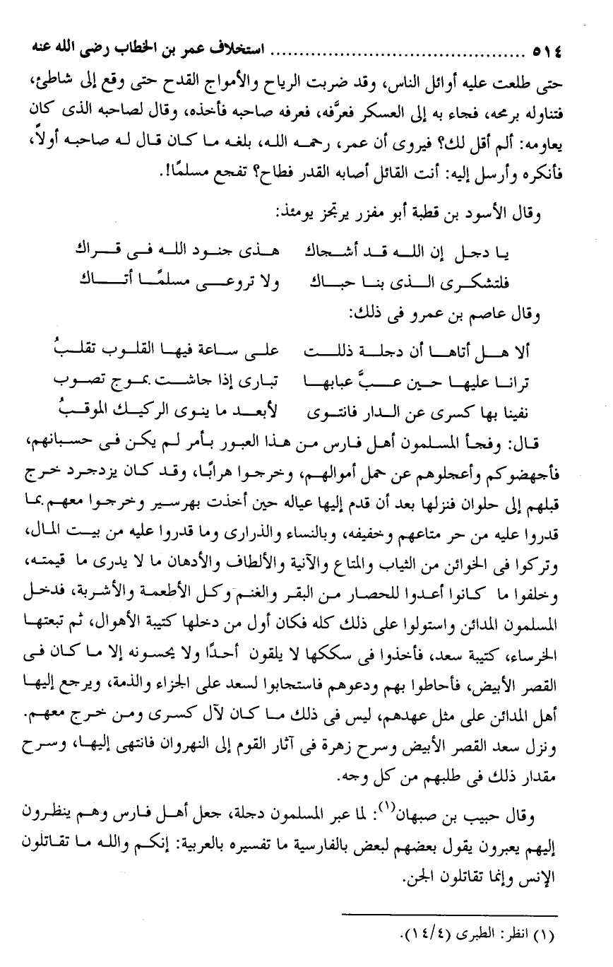 وقال حبيب بن صبهان «1» : لما عبر المسلمون دجلة، جعل أهل فارس وهم ينظرون إليهم يعبرون يقول بعضهم لبعض بالفارسية ما تفسيره بالعربية: إنكم والله ما تقاتلون الإنس وإنما تقاتلون الجن.