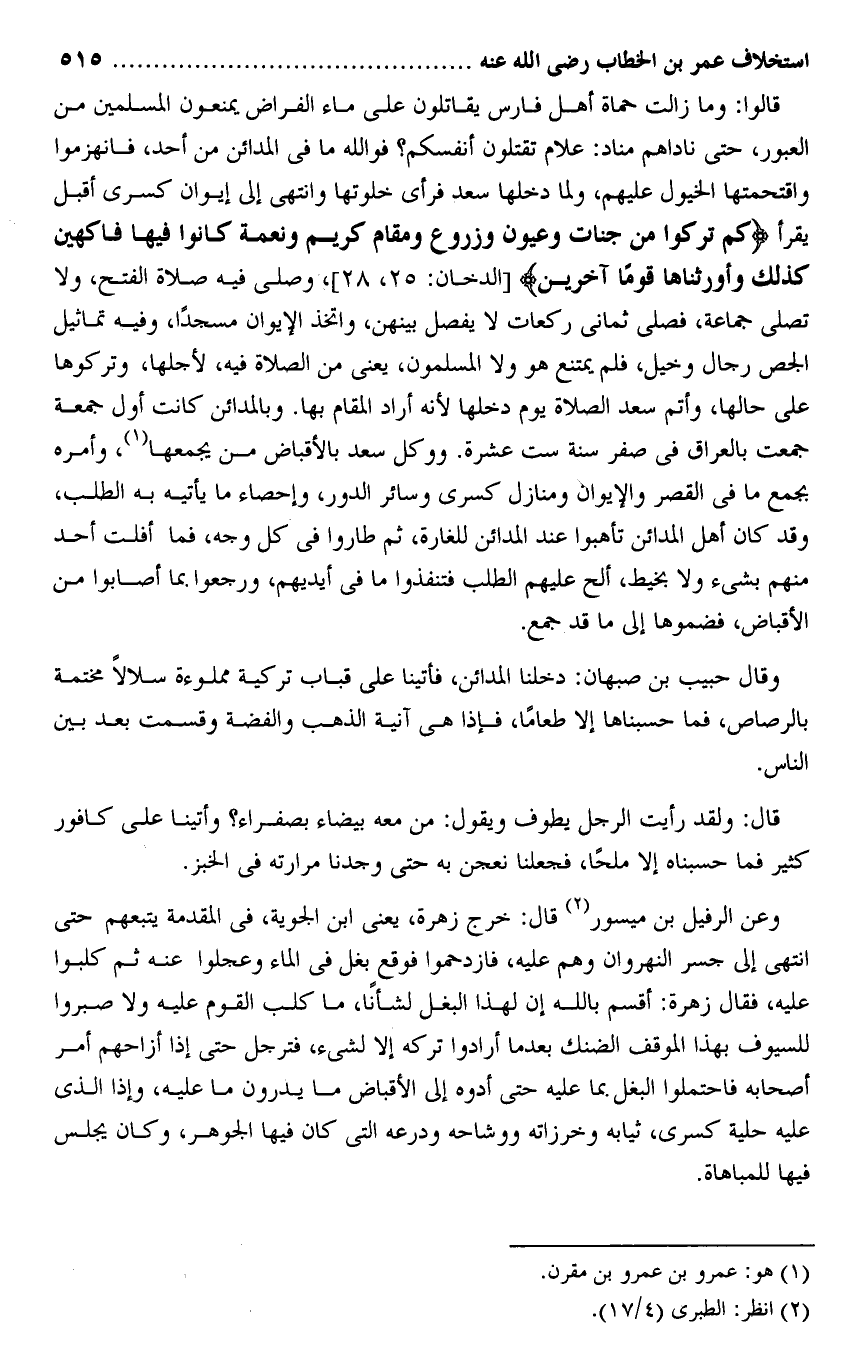 وعن الرفيل بن ميسور «2» قال: خرج زهرة، يعنى ابن الجوية، فى المقدمة يتبعهم حتى انتهى إلى جسر النهروان وهم عليه، فازدحموا فوقع بغل فى الماء وعجلوا عنه ثم كلبوا عليه، فقال زهرة: أقسم بالله إن لهذا البغل لشأنا، ما كلب القوم عليه ولا صبروا للسيوف بهذا الموقف الضنك بعد ما أرادوا تركه إلا لشىء، فترجل حتى إذا أزاحهم أمر أصحابه فاحتملوا البغل بما عليه حتى أدوه إلى الأقباض ما يدرون ما عليه، وإذا الذى عليه حلية كسرى، ثيابه وخرزاته ووشاحه ودرعه التى كان فيها الجوهر، وكان يجلس فيها للمباهاة.