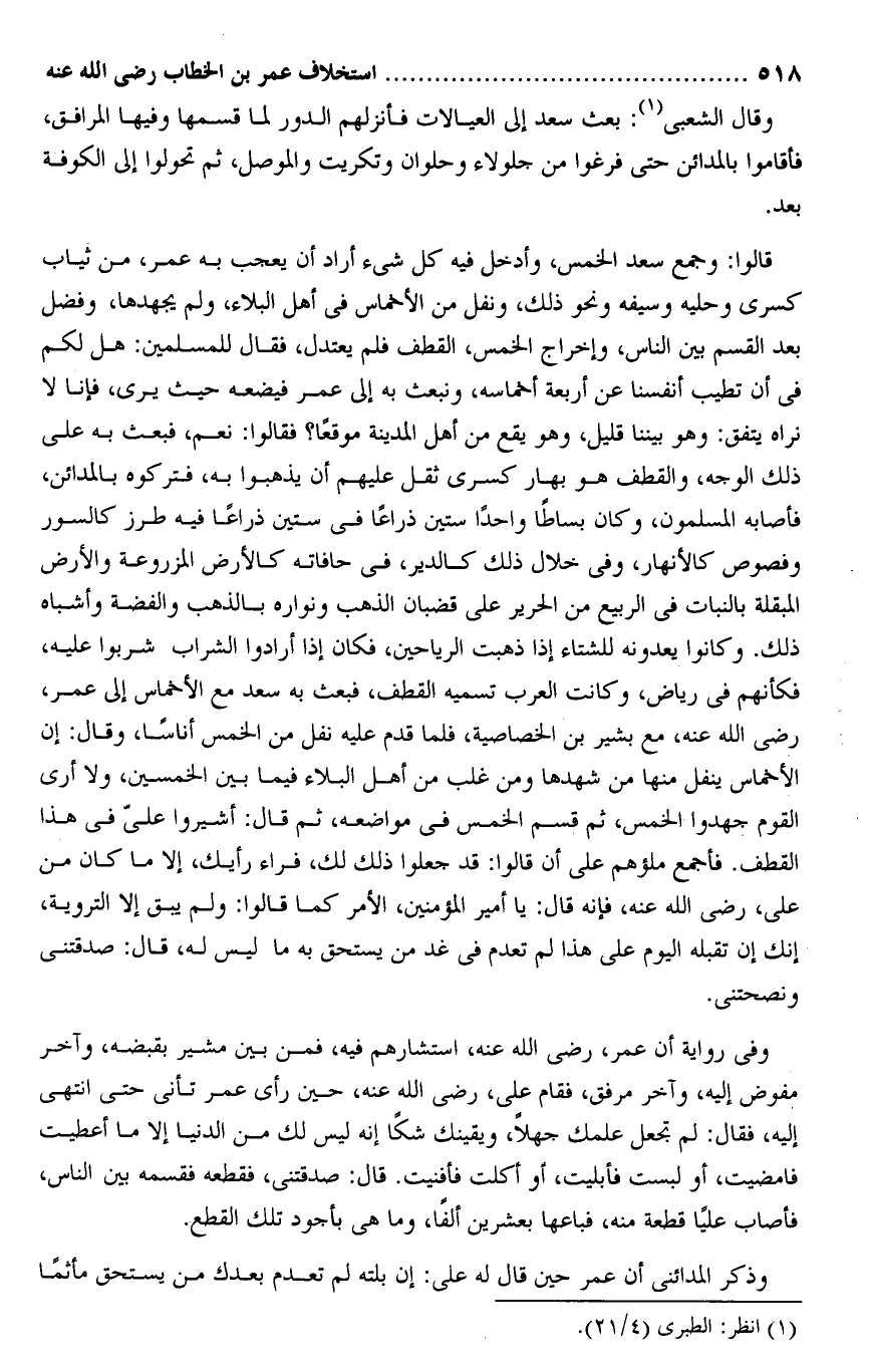 وفى رواية أن عمر، رضى الله عنه، استشارهم فيه، فمن بين مشير بقبضه، وآخر مفوض إليه، وآخر مرفق، فقام على، رضى الله عنه، حين رأى عمر تأنى حتى انتهى إليه، فقال: لم تجعل علمك جهلا، ويقينك شكّا إنه ليس لك من الدنيا إلا ما أعطيت فامضيت، أو لبست فأبليت، أو أكلت فأفنيت. قال: صدقتنى، فقطعه فقسمه بين الناس، فأصاب عليا قطعة منه، فباعها بعشرين ألفا، وما هى بأجود تلك القطع.