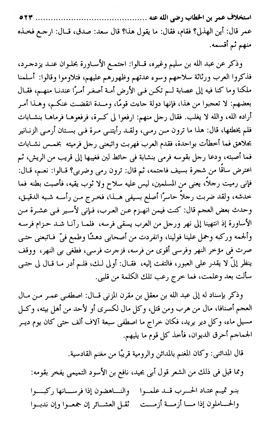 فإنى رميت رجلا، يعنى من المسلمين، ليس عليه سلاح ولا ثوب يقيه، فأصبت بطنه فما خدشه، ولقد ضربت رجلا حاسرا أصلع بسيفى هذا، فخرج من رأسه شبه الدقيق، وحدث بعض العجم قال: كنت فيمن انهزم عن العرب، فإنى لأسير فى عشرة من الأساورة إذ انتهينا إلى نهر ورجل من العرب يسقى فرسه، فلما رآنا شد حزام فرسه وألجمه وركبه وحمل علينا فولينا، وانفردت من أصحابى دهشا وطمع فىّ فاتبعنى حتى صرت فى مؤخر النهر وفرسى أقوى من فرسه، فزجرت فرسى، فطغى بى النهر، ووقف ينظر إلىّ لا يقدر على العبور، فالتفت إليه، فقال: أولى لك، فلم أدر ما قال لى حتى سألت بعد وعلمت، فما خرج رعب تلك الكلمة من قلبى.