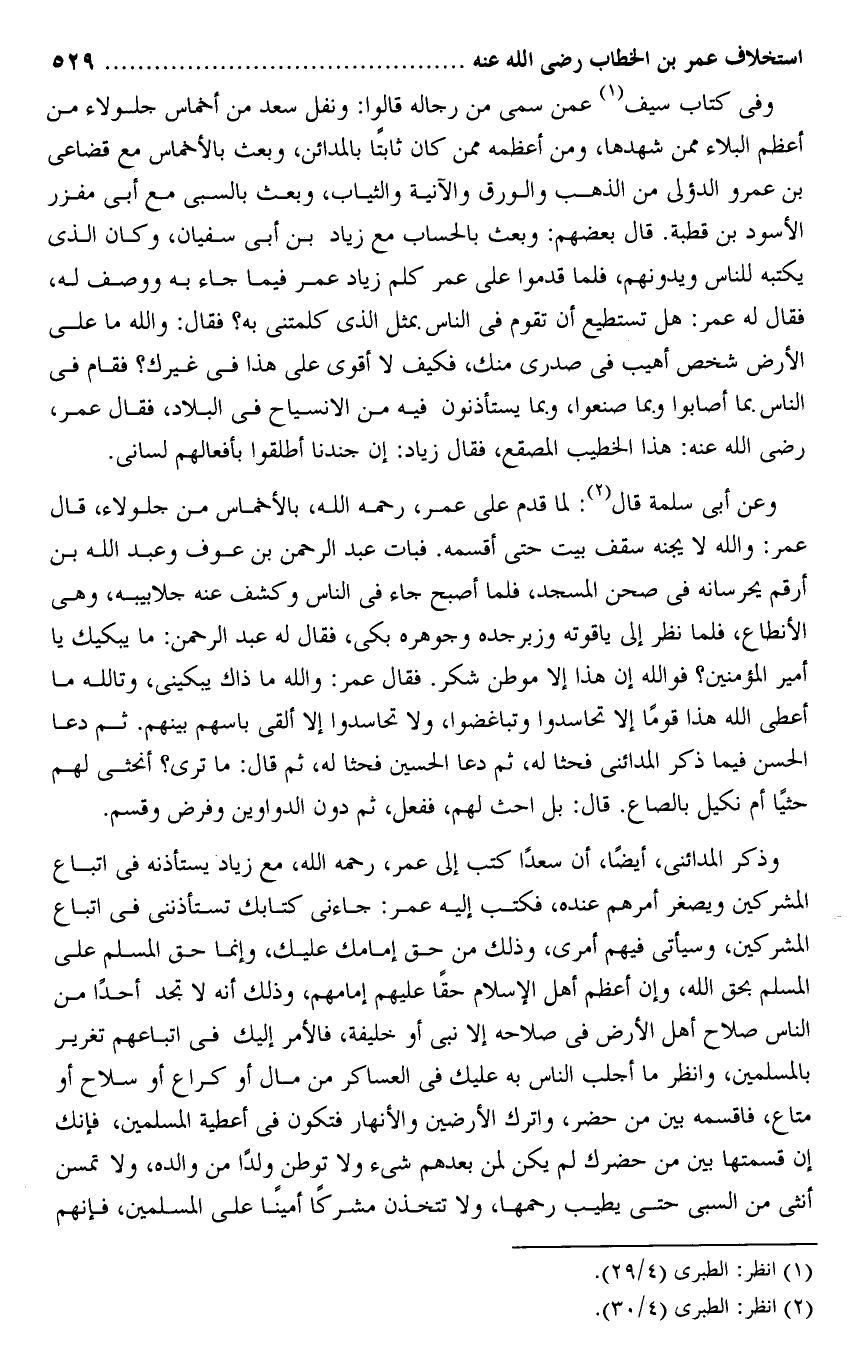 وذكر المدائنى، أيضا، أن سعدا كتب إلى عمر، رحمه الله، مع زياد يستأذنه فى اتباع المشركين ويصغر أمرهم عنده، فكتب إليه عمر: جاءنى كتابك تستأذننى فى اتباع المشركين، وسيأتى فيهم أمرى، وذلك من حق إمامك عليك، وإنما حق المسلم على المسلم بحق الله، وإن أعظم أهل الإسلام حقا عليهم إمامهم، وذلك أنه لا تجد أحدا من الناس صلاح أهل الأرض فى صلاحه إلا نبى أو خليفة، فالأمر إليك فى اتباعهم تغرير بالمسلمين، وانظر ما أجلب الناس به عليك فى العساكر من مال أو كراع أو سلاح أو متاع، فاقسمه بين من حضر، واترك الأرضين والأنهار فتكون فى أعطية المسلمين، فإنك إن قسمتها بين من حضرك لم يكن لمن بعدهم شىء ولا توطن ولدا من والده، ولا تمسن أنثى من السبى حتى يطيب رحمها، ولا تتخذن مشركا أمينا على المسلمين، فإنهم