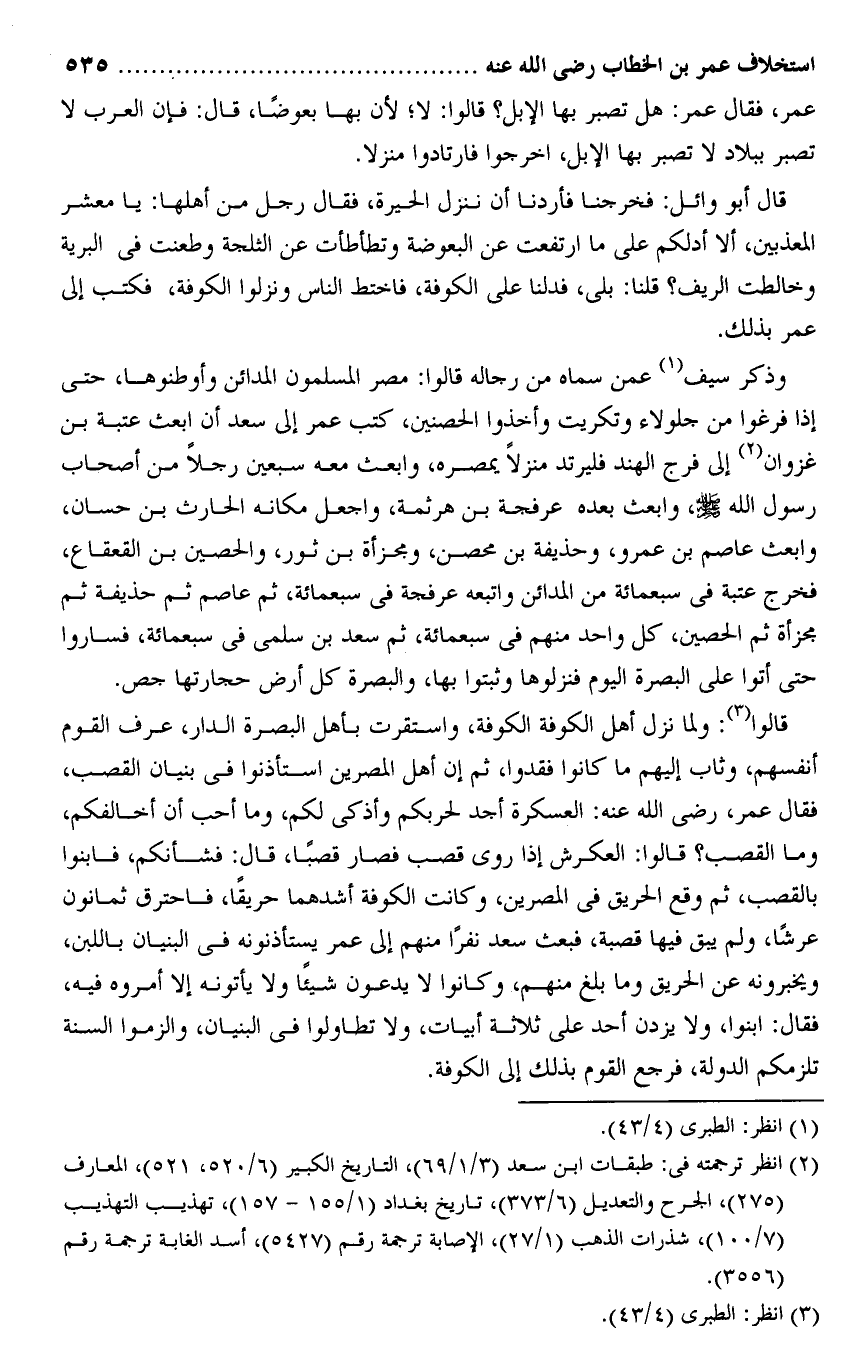 عمر، فقال عمر: هل تصبر بها الإبل؟ قالوا: لا؛ لأن بها بعوضا، قال: فإن العرب لا تصبر ببلاد لا تصبر بها الإبل، اخرجوا فارتادوا منزلا.