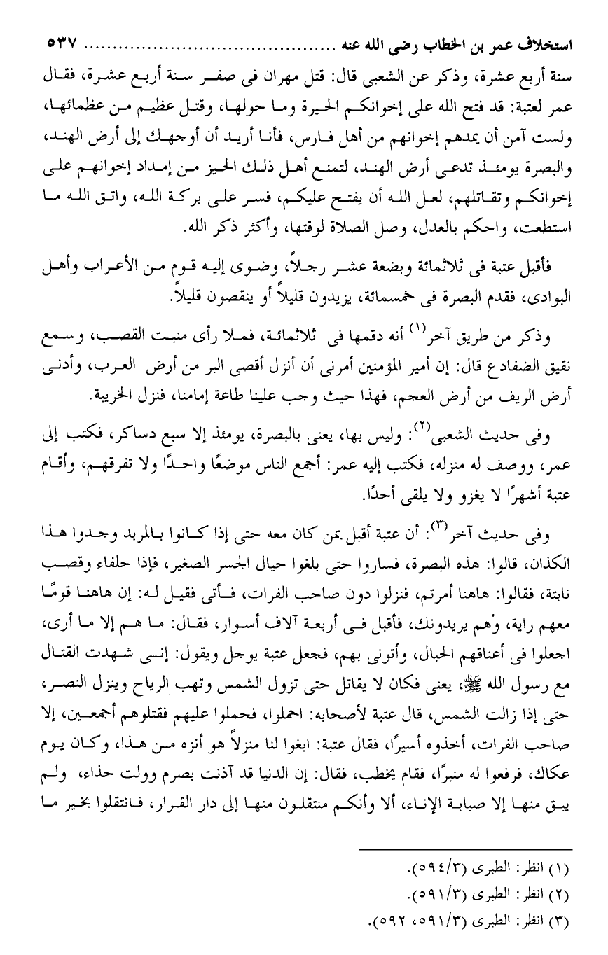 سنة أربع عشرة، وذكر عن الشعبى قال: قتل مهران فى صفر سنة أربع عشرة، فقال عمر لعتبة: قد فتح الله على إخوانكم الحيرة وما حولها، وقتل عظيم من عظمائها، ولست آمن أن يمدهم إخوانهم من أهل فارس، فأنا أريد أن أوجهك إلى أرض الهند، والبصرة يومئذ تدعى أرض الهند، لتمنع أهل ذلك الحيز من إمداد إخوانهم على إخوانكم وتقاتلهم، لعل الله أن يفتح عليكم، فسر على بركة الله، واتق الله ما استطعت، واحكم بالعدل، وصل الصلاة لوقتها، وأكثر ذكر الله.