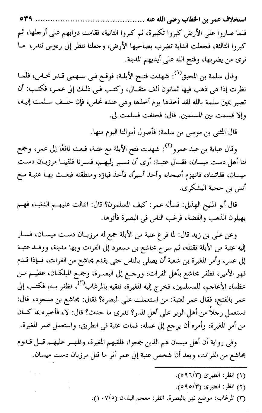 وعن على بن زيد قال: لما فرغ عتبة من الأبلة جمع له مرزبان دست ميسان، فسار إليه عتبة من الأبلة فقتله، ثم سرح مجاشع بن مسعود إلى الفرات وبها مدينة، ووفد عتبة إلى عمر، وأمر المغيرة بن شعبة أن يصلى بالناس حتى يقدم مجاشع من الفرات، فإذا قدم فهو الأمير، فظفر مجاشع بأهل الفرات، ورجع إلى البصرة، وجمع الميلكان، عظيم من عظماء الأعاجم، للمسلمين، فخرج إليه المغيرة، فلقيه بالمرغاب «3» ، فظفر به، فكتب إلى عمر بالفتح، فقال عمر لعتبة: من استعملت على البصرة؟ فقال: مجاشع بن مسعود، قال: