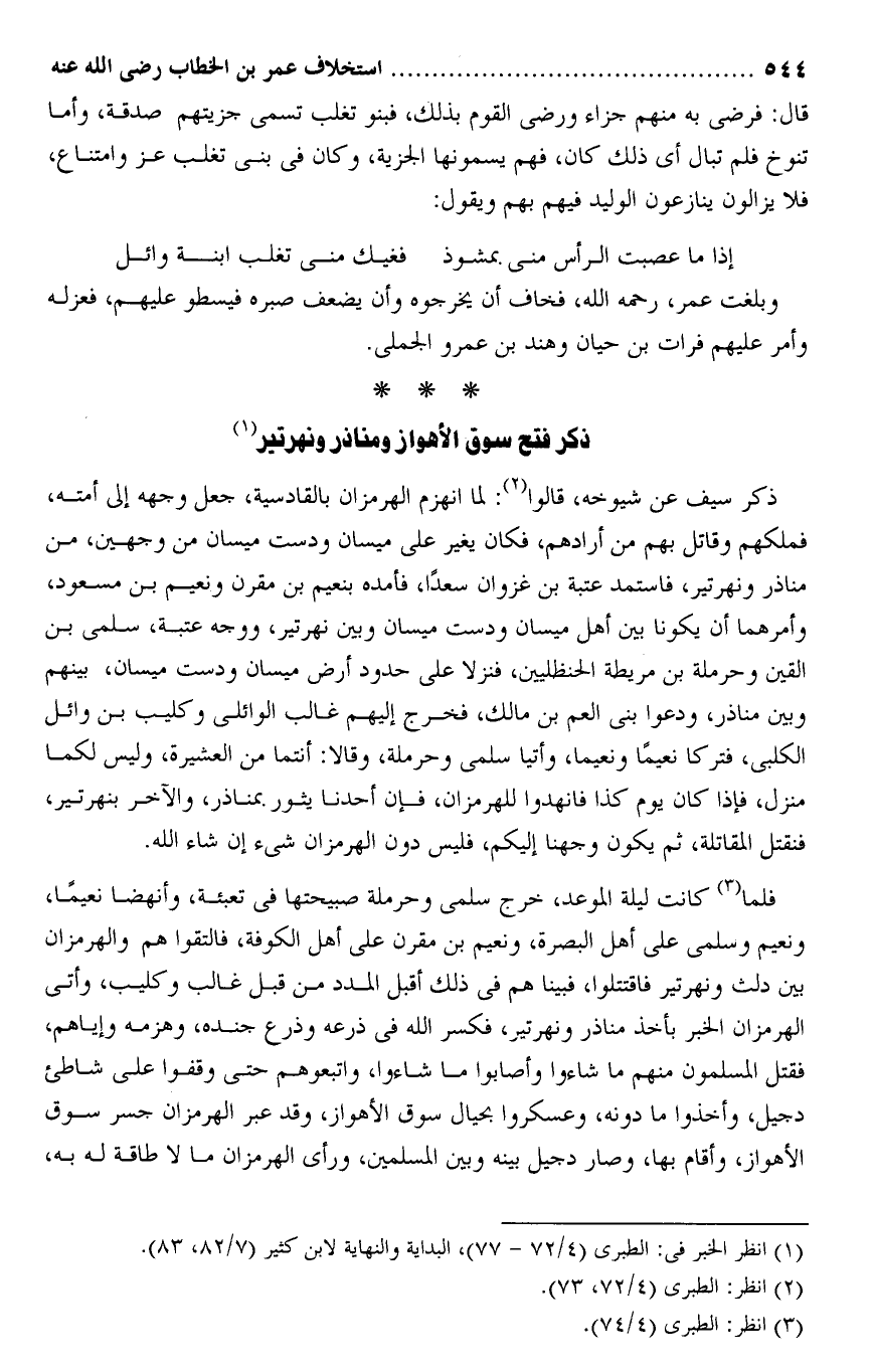 وبلغت عمر، رحمه الله، فخاف أن يخرجوه وأن يضعف صبره فيسطو عليهم، فعزله وأمر عليهم فرات بن حيان وهند بن عمرو الجملى.