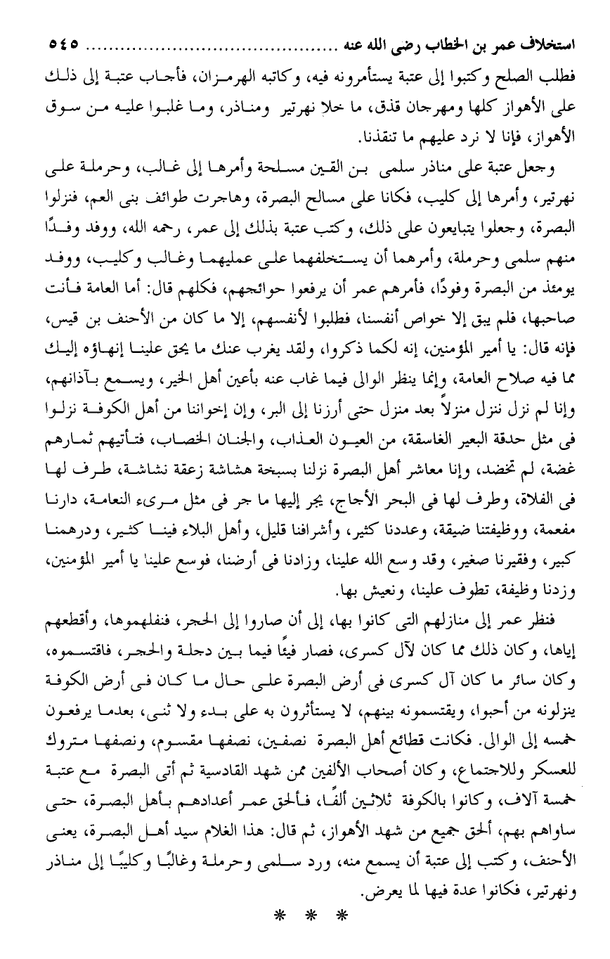 فنظر عمر إلى منازلهم التى كانوا بها، إلى أن صاروا إلى الحجر، فنفلهموها، وأقطعهم إياها، وكان ذلك مما كان لآل كسرى، فصار فيئا فيما بين دجلة والحجر، فاقتسموه، وكان سائر ما كان آل كسرى فى أرض البصرة على حال ما كان فى أرض الكوفة ينزلونه من أحبوا، ويقتسمونه بينهم، لا يستأثرون به على بدء ولا ثنى، بعد ما يرفعون خمسه إلى الوالى. فكانت قطائع أهل البصرة نصفين، نصفها مقسوم، ونصفها متروك للعسكر وللاجتماع، وكان أصحاب الألفين ممن شهد القادسية ثم أتى البصرة مع عتبة خمسة آلاف، وكانوا بالكوفة ثلاثين ألفا، فألحق عمر أعدادهم بأهل البصرة، حتى ساواهم بهم، ألحق جميع من شهد الأهواز، ثم قال: هذا الغلام سيد أهل البصرة، يعنى الأحنف، وكتب إلى عتبة أن يسمع منه، ورد سلمى وحرملة وغالبا وكليبا إلى مناذر ونهرتير، فكانوا عدة فيها لما يعرض.