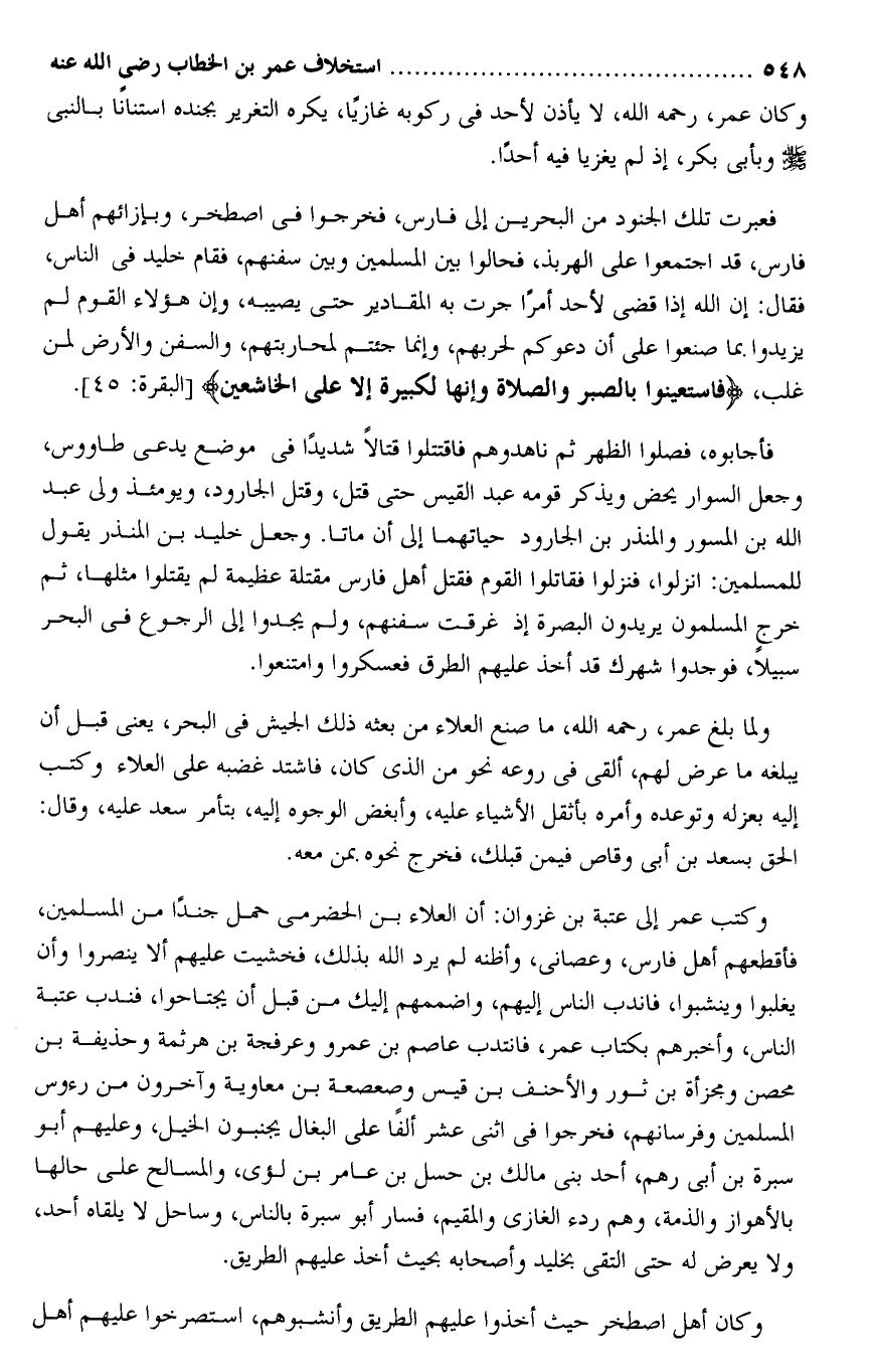 فعبرت تلك الجنود من البحرين إلى فارس، فخرجوا فى اصطخر، وبإزائهم أهل فارس، قد اجتمعوا على الهربذ، فحالوا بين المسلمين وبين سفنهم، فقام خليد فى الناس، فقال: إن الله إذا قضى لأحد أمرا جرت به المقادير حتى يصيبه، وإن هؤلاء القوم لم يزيدوا بما صنعوا على أن دعوكم لحربهم، وإنما جئتم لمحاربتهم، والسفن والأرض لمن غلب، وَاسْتَعِينُوا بِالصَّبْرِ وَالصَّلاةِ وَإِنَّها لَكَبِيرَةٌ إِلَّا عَلَى الْخاشِعِينَ [البقرة: 45] .