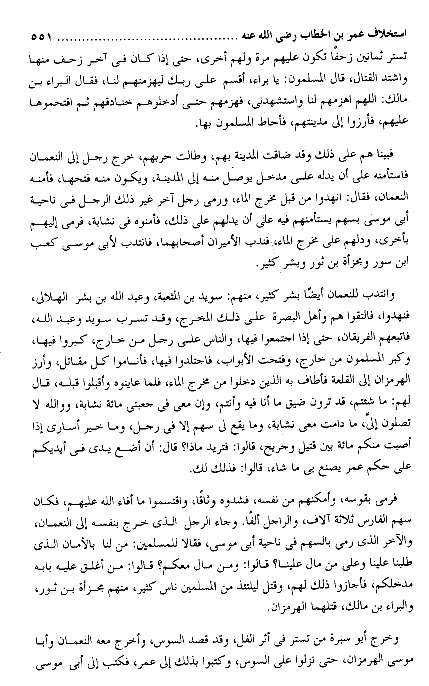 وانتدب للنعمان أيضا بشر كثير، منهم: سويد بن المثعبة، وعبد الله بن بشر الهلالى، فنهدوا، فالتقوا هم وأهل البصرة على ذلك المخرج، وقد تسرب سويد وعبد الله، فاتبعهم الفريقان، حتى إذا اجتمعوا فيها، والناس على رجل من خارج، كبروا فيها، وكبر المسلمون من خارج، وفتحت الأبواب، فاجتلدوا فيها، فأناموا كل مقاتل، وأرز الهرمزان إلى القلعة فأطاف به الذين دخلوا من مخرج الماء، فلما عاينوه وأقبلوا قبله، قال لهم: ما شئتم، قد ترون ضيق ما أنا فيه وأنتم، وإن معى فى جعبتى مائة نشابة، وو الله لا تصلون إلىّ، ما دامت معى نشابة، وما يقع لى سهم إلا فى رجل، وما خير أسارى إذا أصبت منكم مائة بين قتيل وجريح، قالوا: فتريد ماذا؟ قال: أن أضع يدى فى أيديكم على حكم عمر يصنع بى ما شاء، قالوا: فذلك لك.