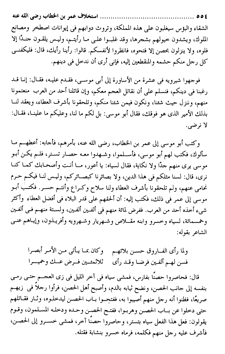 قال: فحاصروا حصنا بفارس، فمشى سياه فى آخر الليل فى زى العجم حتى رمى بنفسه إلى جانب الحصن، ونضح ثيابه بالدم، وأصبح أهل الحصن، فرأوا رجلا فى زيهم صريعا، فظنوا أنه رجل منهم أصيبوا به، ففتحوا باب الحصن ليدخلوه، وثار فقاتلهم حتى دخلوا عن باب الحصن وهربوا، ففتح الحصن وحده ودخله المسلمون، وقوم يقولون: فعل هذا الفعل سياه بتستر، وحاصروا حصنا آخر، فمشى خسرو إلى الحصن، فأشرف عليه رجل منهم فكلمه، فرماه خسرو بنشابة فقتله.