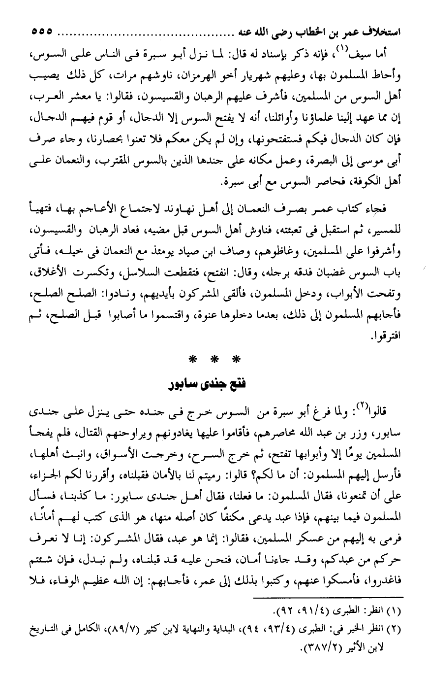 قالوا «2» : ولما فرغ أبو سبرة من السوس خرج فى جنده حتى ينزل على جندى سابور، وزر بن عبد الله محاصرهم، فأقاموا عليها يغادونهم ويراوحنهم القتال، فلم يفجأ المسلمين يوما إلا وأبوابها تفتح، ثم خرج السرح، وخرجت الأسواق، وانبث أهلها، فأرسل إليهم المسلمون: أن ما لكم؟ قالوا: رميتم لنا بالأمان فقبلناه، وأقررنا لكم الجزاء، على أن تمنعونا، فقال المسلمون: ما فعلنا، فقال أهل جندى سابور: ما كذبنا، فسأل المسلمون فيما بينهم، فإذا عبد يدعى مكنفا كان أصله منها، هو الذى كتب لهم أمانا، فرمى به إليهم من عسكر المسلمين، فقالوا: إنما هو عبد، فقال المشركون: إنا لا نعرف حركم من عبدكم، وقد جاءنا أمان، فنحن عليه قد قبلناه، ولم نبدل، فإن شئتم فاغدروا، فأمسكوا عنهم، وكتبوا بذلك إلى عمر، فأجابهم: إن الله عظيم الوفاء، فلا