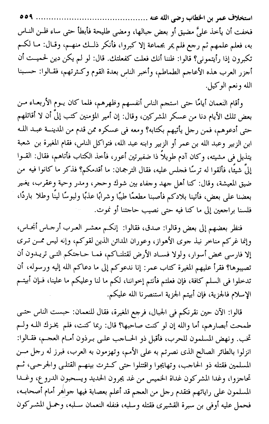 وأقام النعمان أياما حتى استجم الناس أنفسهم وظهرهم، فلما كان يوم الأربعاء من بعض تلك الأيام دنا من عسكر المشركين، وقال: إن أمير المؤمنين كتب إلىّ أن لا أقاتلهم حتى أدعوهم، فمن رجل يأتيهم بكتابه؟ ومعه فى عسكره ممن قدم من المدينة عبد الله ابن الزبير وعبد الله بن عمر أو الزبير وابنه عبد الله، فتواكل الناس، فقام المغيرة بن شعبة يتذيل فى مشيته، وكان آدم طويلا ذا ضفيرتين أعور، فأخذ الكتاب فأتاهم، فقال: القوا إلىّ شيئا، فألقوا له ترسا فجلس عليه، فقال الترجمان: ما أقدمكم؟ فذكر ما كانوا فيه من ضيق المعيشة، وقال: كنا أهل جهد وجفاء بين شوك وحجر، ومدر وحية وعقرب، يغير بعضنا على بعض، فأتينا بلادكم فأصبنا مطعما طيبا وشرابا عذبا ولبوسا لينا وطلا باردا، فلسنا براجعين إلى ما كنا فيه حتى نصيب حاجتنا أو نموت.