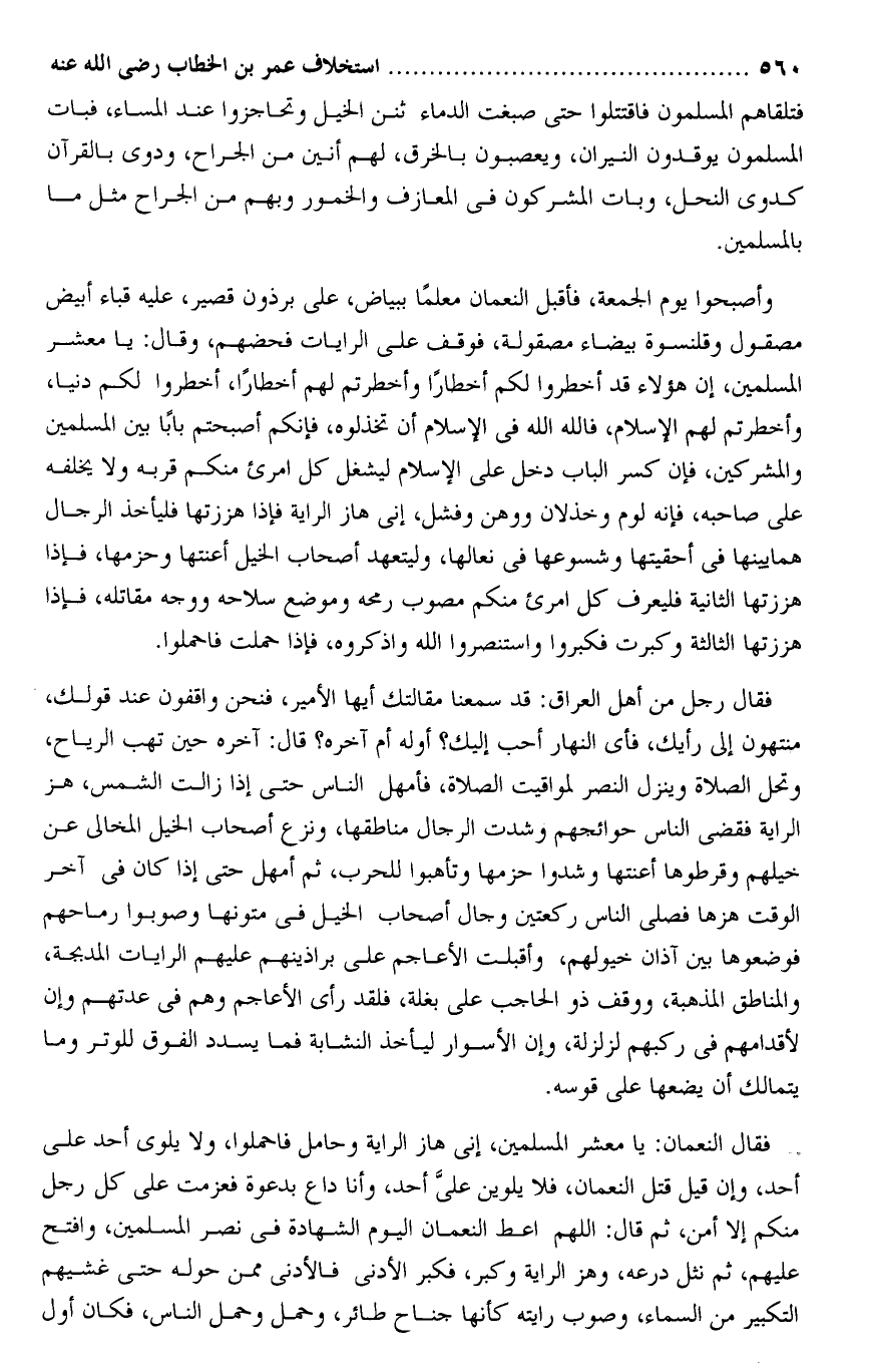 وأصبحوا يوم الجمعة، فأقبل النعمان معلما ببياض، على برذون قصير، عليه قباء أبيض مصقول وقلنسوة بيضاء مصقولة، فوقف على الرايات فحضهم، وقال: يا معشر المسلمين، إن هؤلاء قد أخطروا لكم أخطارا وأخطرتم لهم أخطارا، أخطروا لكم دنيا، وأخطرتم لهم الإسلام، فالله الله فى الإسلام أن تخذلوه، فإنكم أصبحتم بابا بين المسلمين والمشركين، فإن كسر الباب دخل على الإسلام ليشغل كل امرئ منكم قربه ولا يخلفه على صاحبه، فإنه لوم وخذلان ووهن وفشل، إنى هاز الراية فإذا هززتها فليأخذ الرجال همايينها فى أحقيتها وشسوعها فى نعالها، وليتعهد أصحاب الخيل أعنتها وحزمها، فإذا هززتها الثانية فليعرف كل امرئ منكم مصوب رمحه وموضع سلاحه ووجه مقاتله، فإذا هززتها الثالثة وكبرت فكبروا واستنصروا الله واذكروه، فإذا حملت فاحملوا.