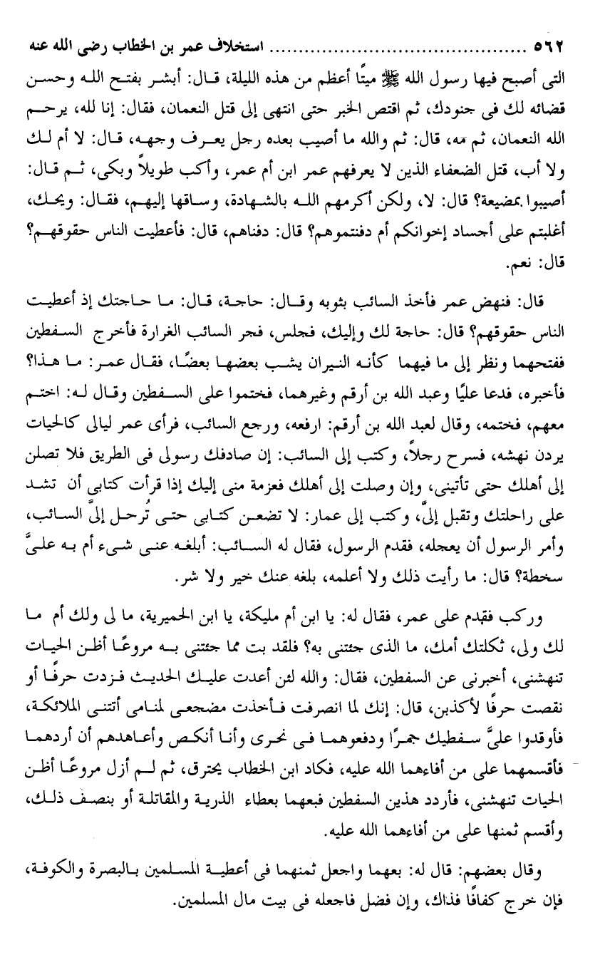 فأخبره، فدعا عليا وعبد الله بن أرقم وغيرهما، فختموا على السفطين وقال له: اختم معهم، فختمه، وقال لعبد الله بن أرقم: ارفعه، ورجع السائب، فرأى عمر ليالى كالحيات يردن نهشه، فسرح رجلا، وكتب إلى السائب: إن صادفك رسولى فى الطريق فلا تصلن إلى أهلك حتى تأتينى، وإن وصلت إلى أهلك فعزمة منى إليك إذا قرأت كتابى أن تشد على راحلتك وتقبل إلىّ، وكتب إلى عمار: لا تضعن كتابى حتى ترحل إلىّ السائب، وأمر الرسول أن يعجله، فقدم الرسول، فقال له السائب: أبلغه عنى شىء أم به علىّ سخطة؟ قال: ما رأيت ذلك ولا أعلمه، بلغه عنك خير ولا شر.